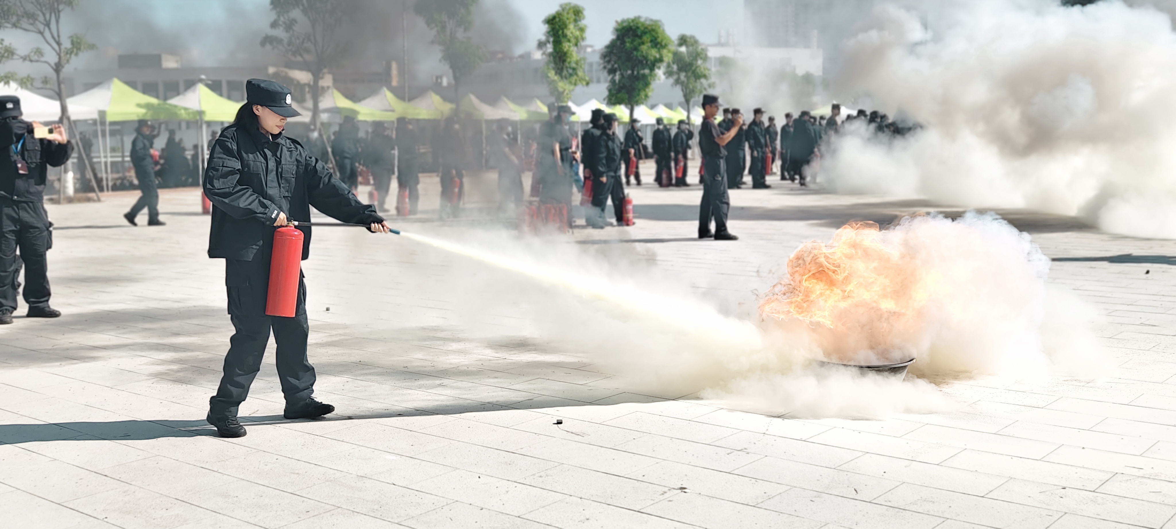 在疏散集合点,消防人员现场演示了高空逃生人员救援、灭火器讲解、参观消防车器材等科目,并组织新生亲自使用灭火器实操灭火、消防水枪操作,让他们在实践中掌握灭火技能。
