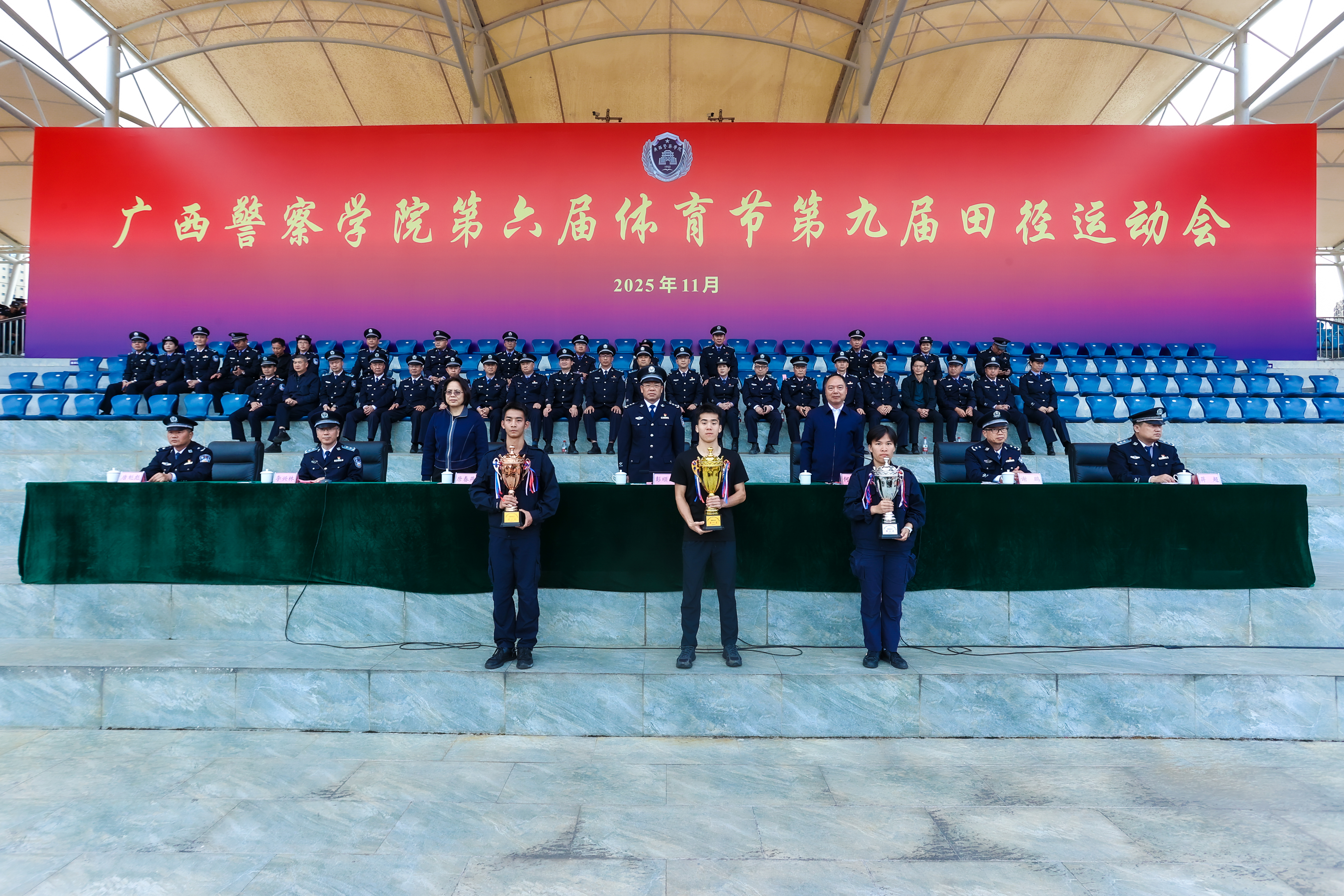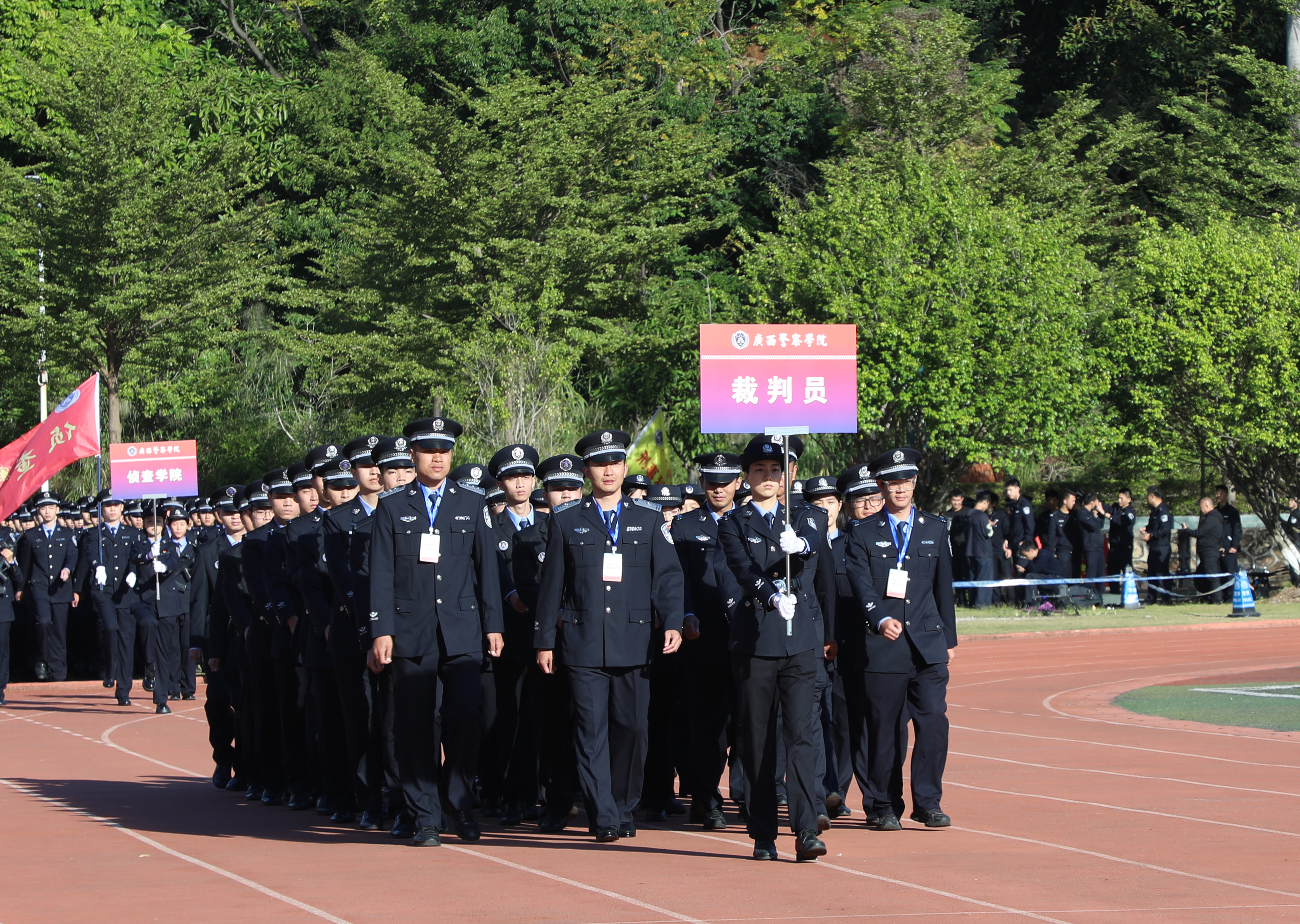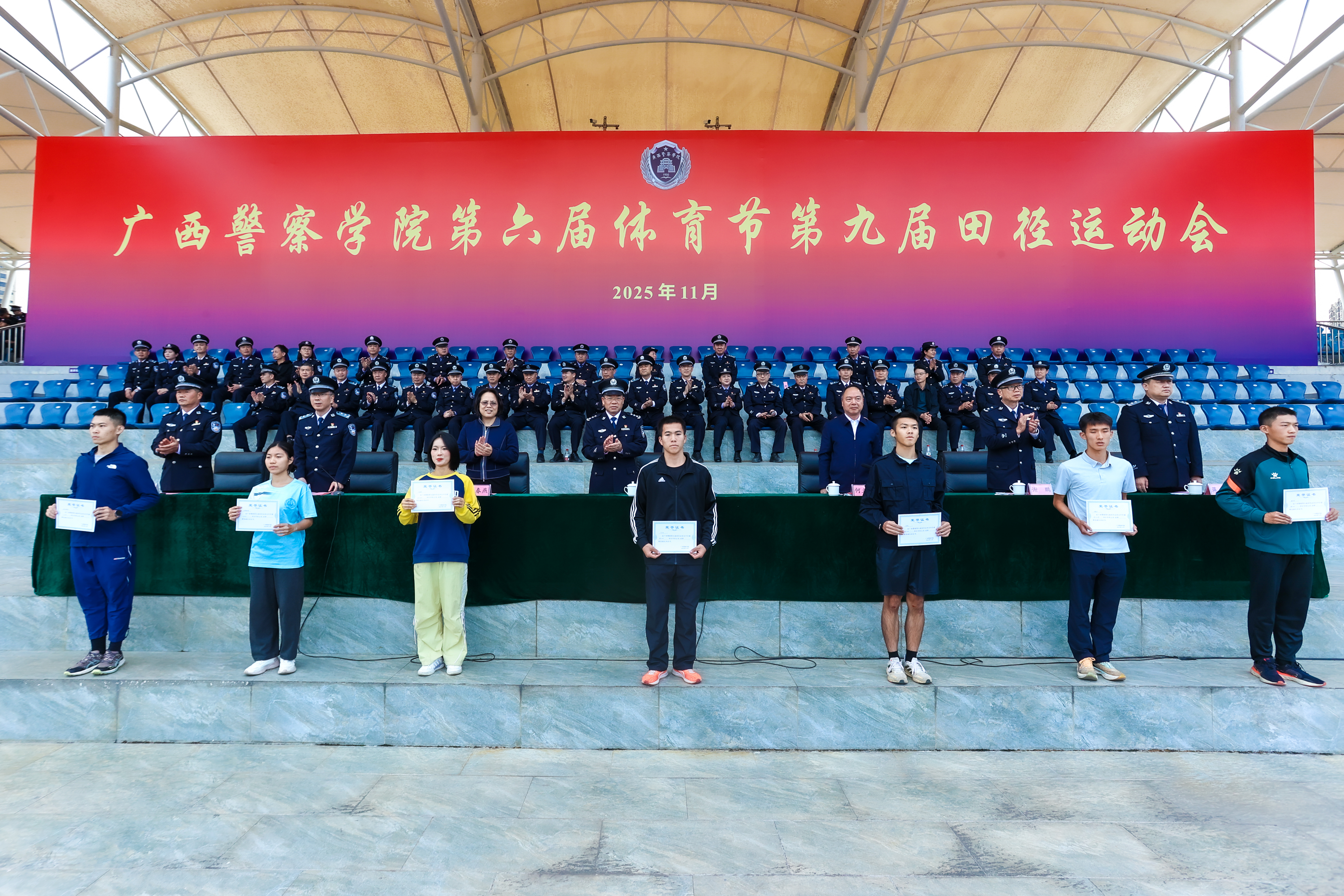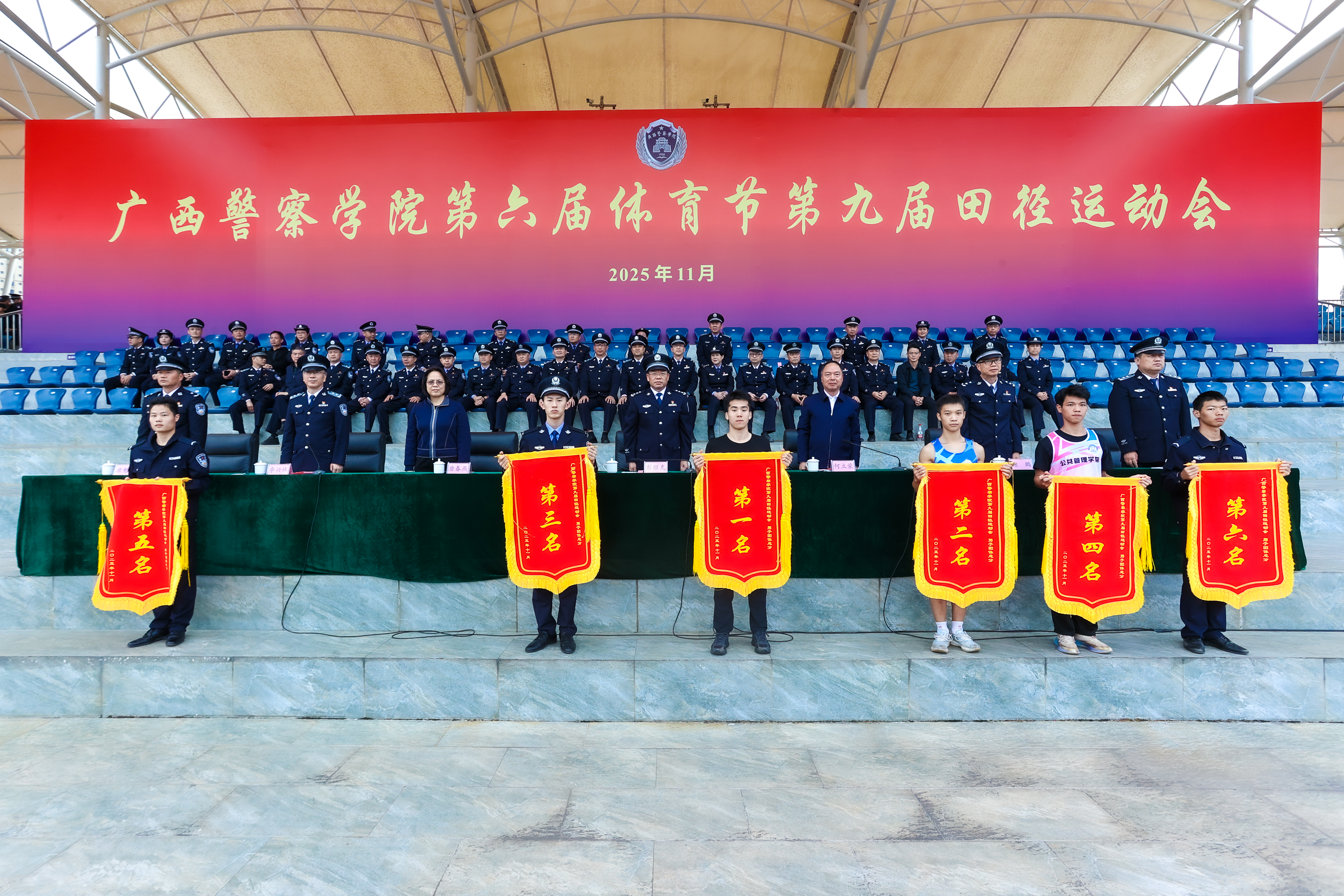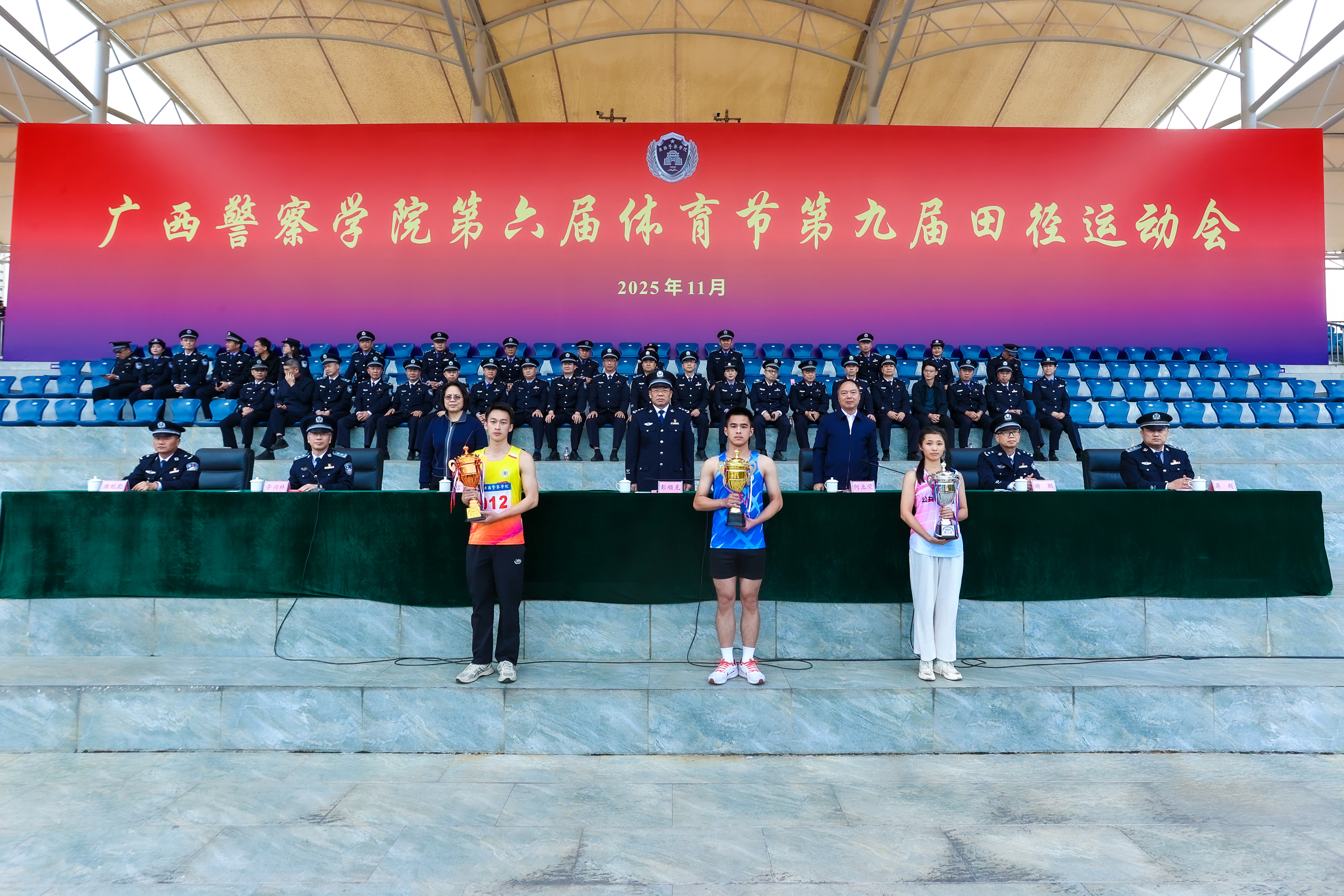 警徽熠熠映晨光,赛场扬威展锋芒。11月21日至22日,学校第六届体育节第九届田径运动会在仙葫校区圆满举行。学校党委书记彭顺克,学校党委副书记、校长何立荣,学校党委副书记唐春燕,自治区纪委监委驻学校纪检监察组组长、学校党委委员、纪委书记黎东,学校党委委员、副校长谢鹏,副校长李兴林,副校长蒋超,学校党委委员、副校长唐魁彪出席开闭幕式。