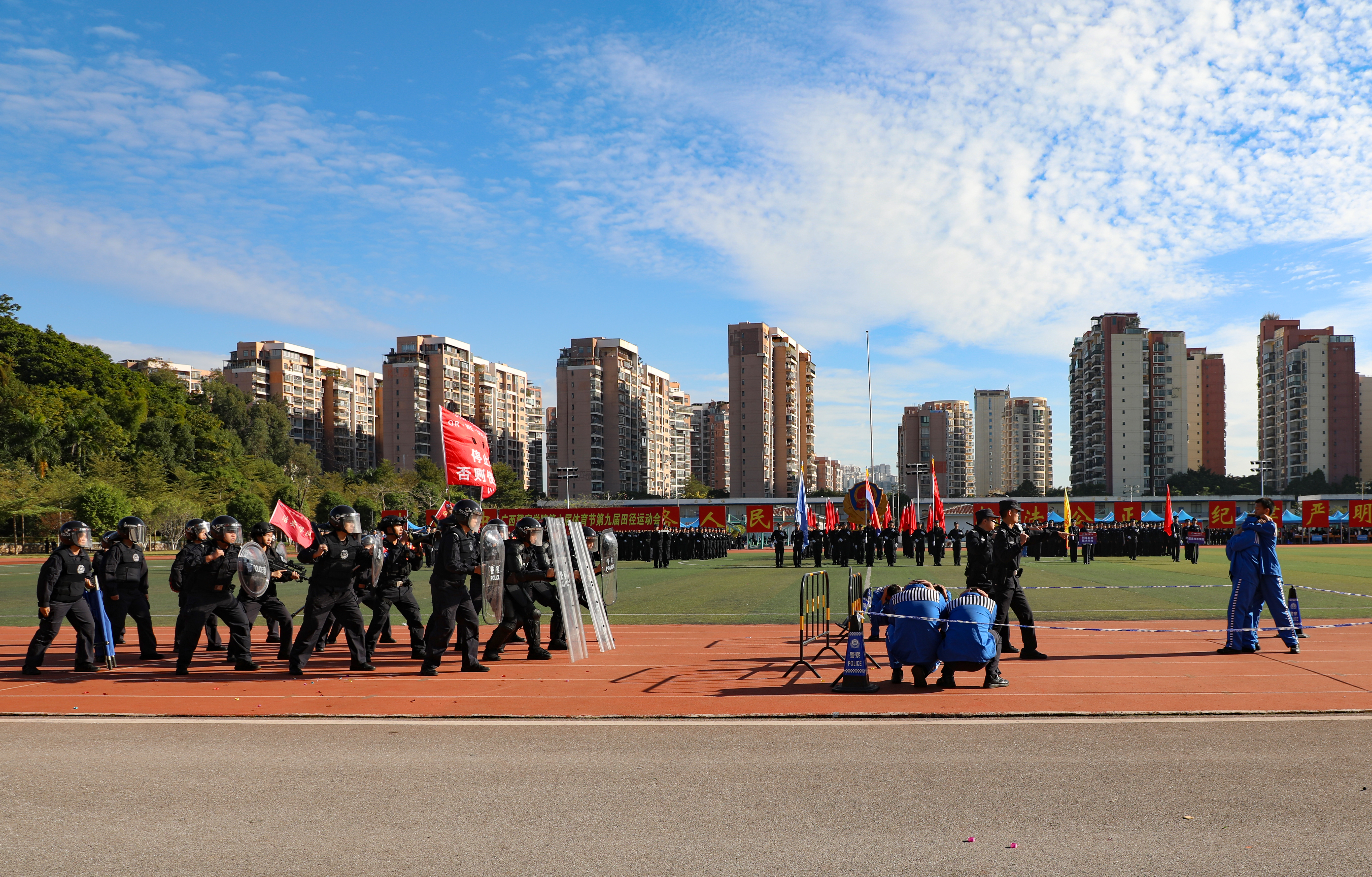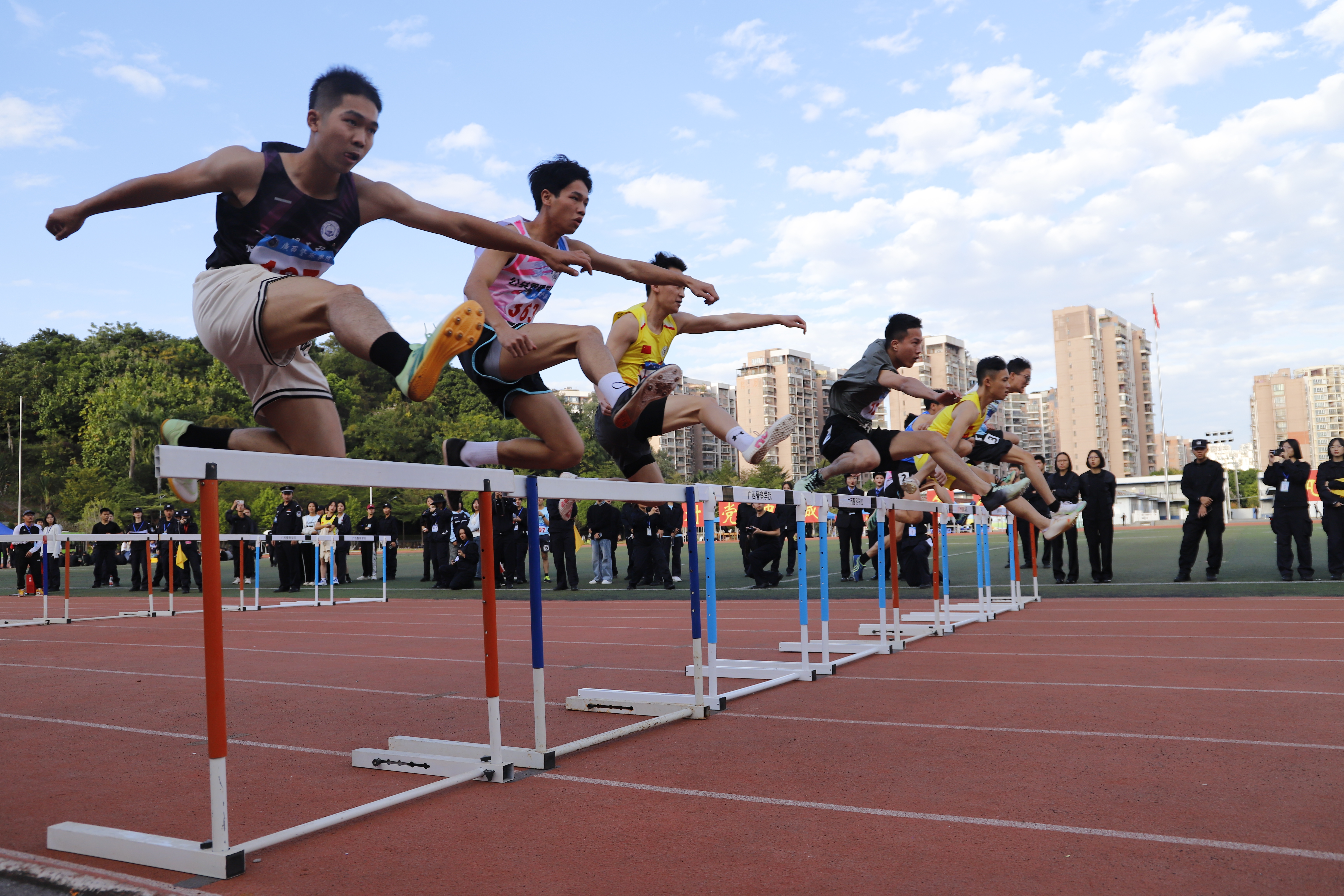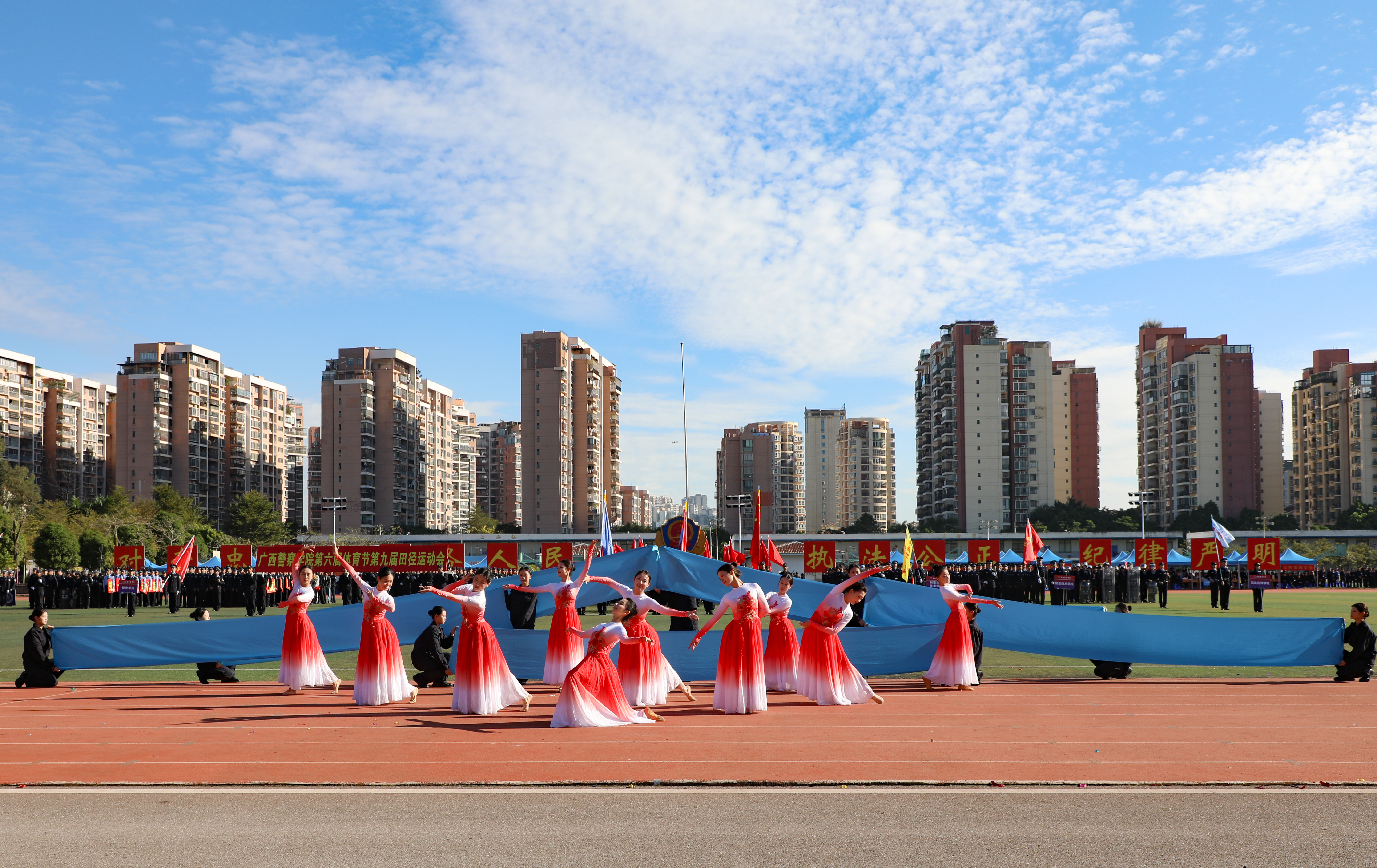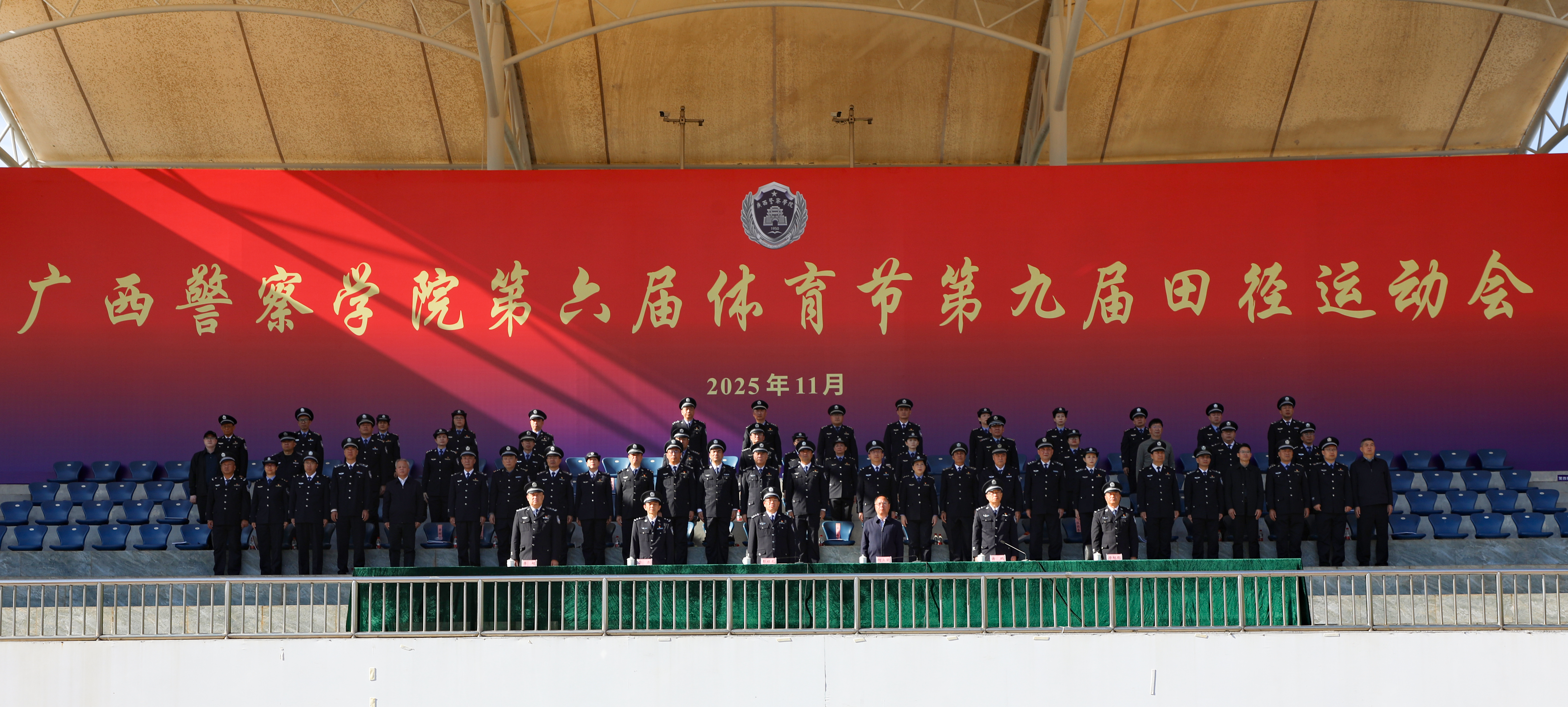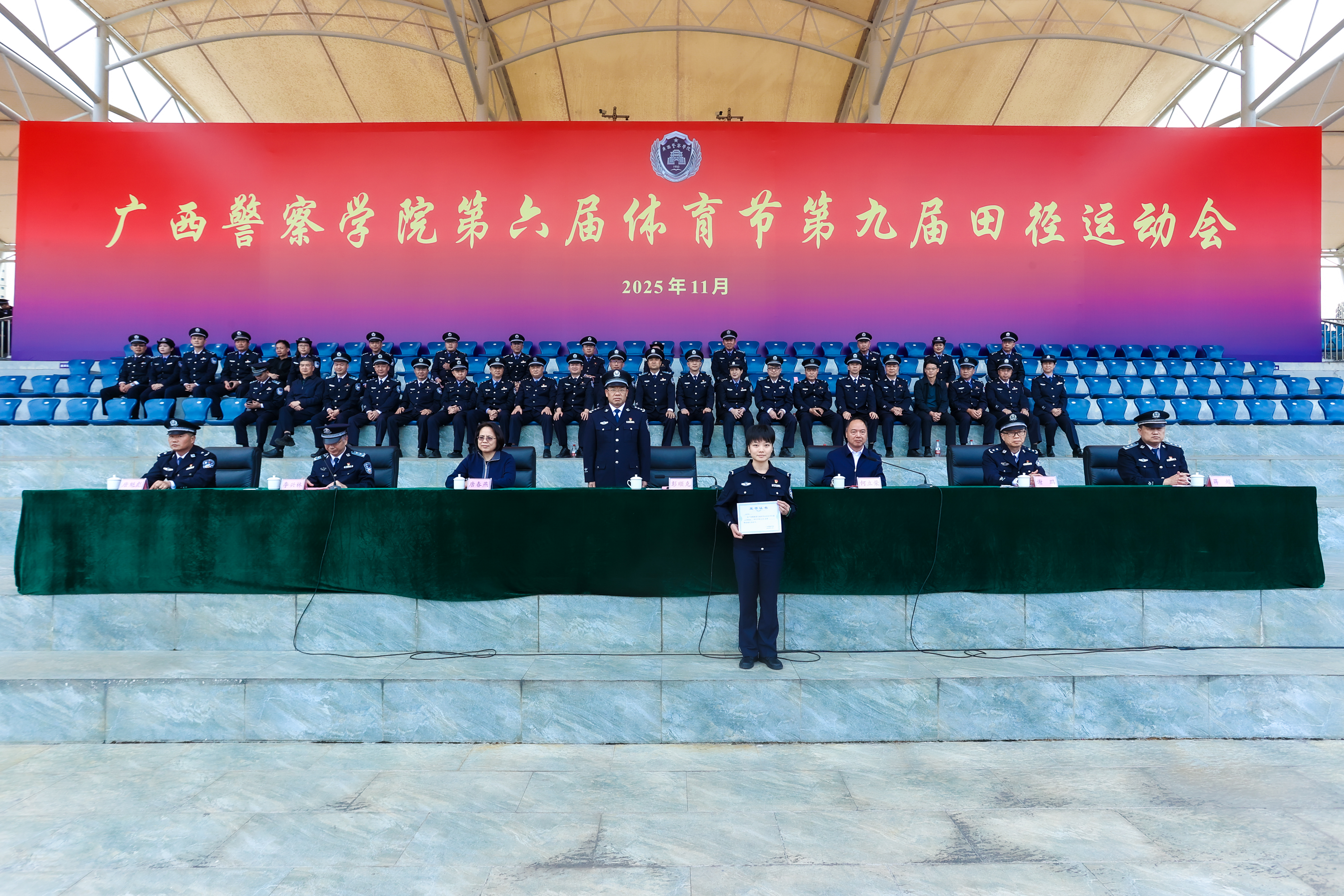 警徽熠熠映晨光,赛场扬威展锋芒。11月21日至22日,学校第六届体育节第九届田径运动会在仙葫校区圆满举行。学校党委书记彭顺克,学校党委副书记、校长何立荣,学校党委副书记唐春燕,自治区纪委监委驻学校纪检监察组组长、学校党委委员、纪委书记黎东,学校党委委员、副校长谢鹏,副校长李兴林,副校长蒋超,学校党委委员、副校长唐魁彪出席开闭幕式。