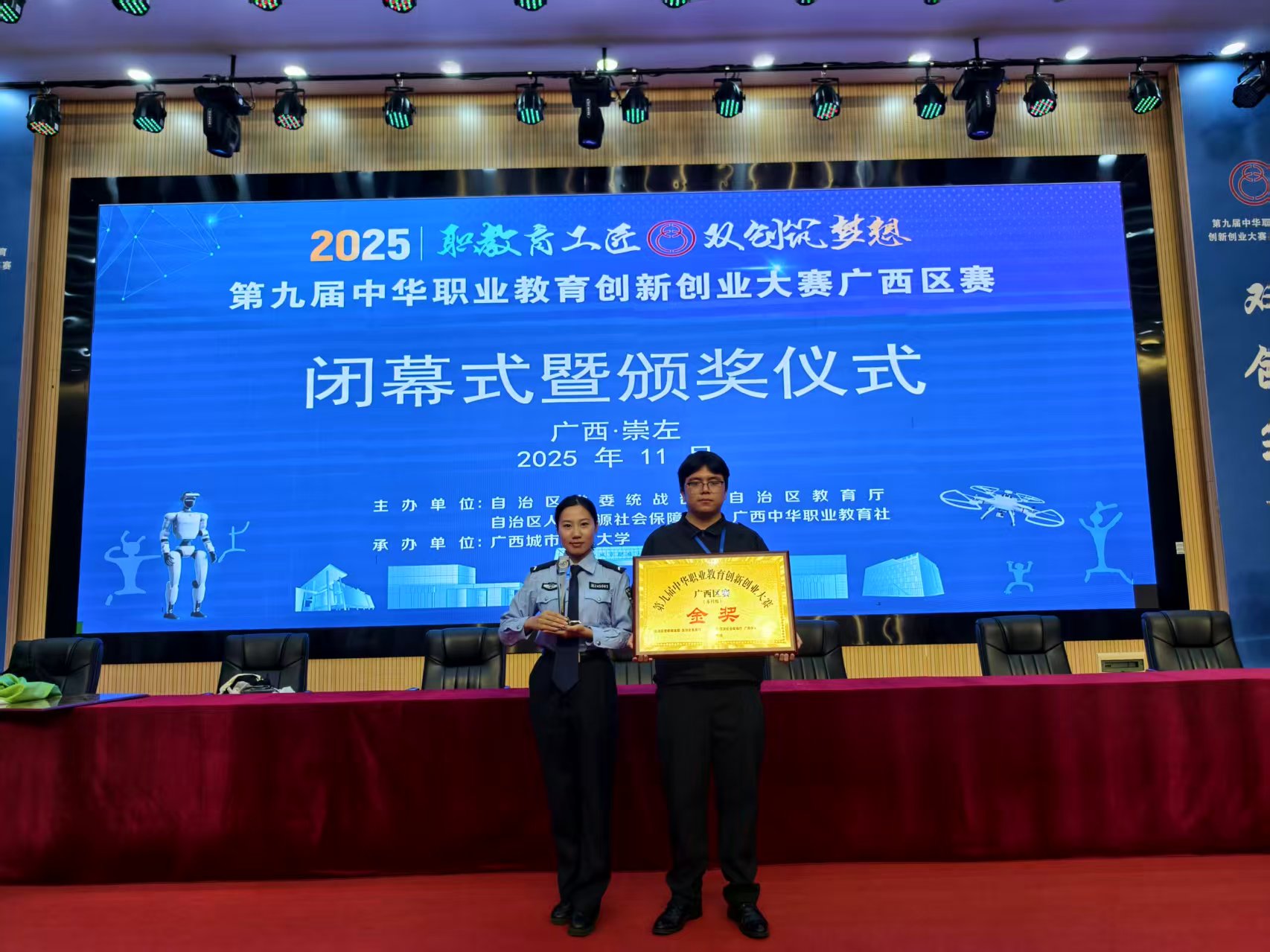 近日,由自治区党委统战部、教育厅、人力资源社会保障厅和广西中华职业教育社主办的第九届中华职业教育创新创业大赛广西区赛在广西城市职业大学圆满落幕。经过激烈角逐,我校选送的参赛作品凭借前沿的技术理念、扎实的实践应用与突出的创新价值,斩获1金1银1铜的优异成绩,1名教师获评“优秀指导教师”。