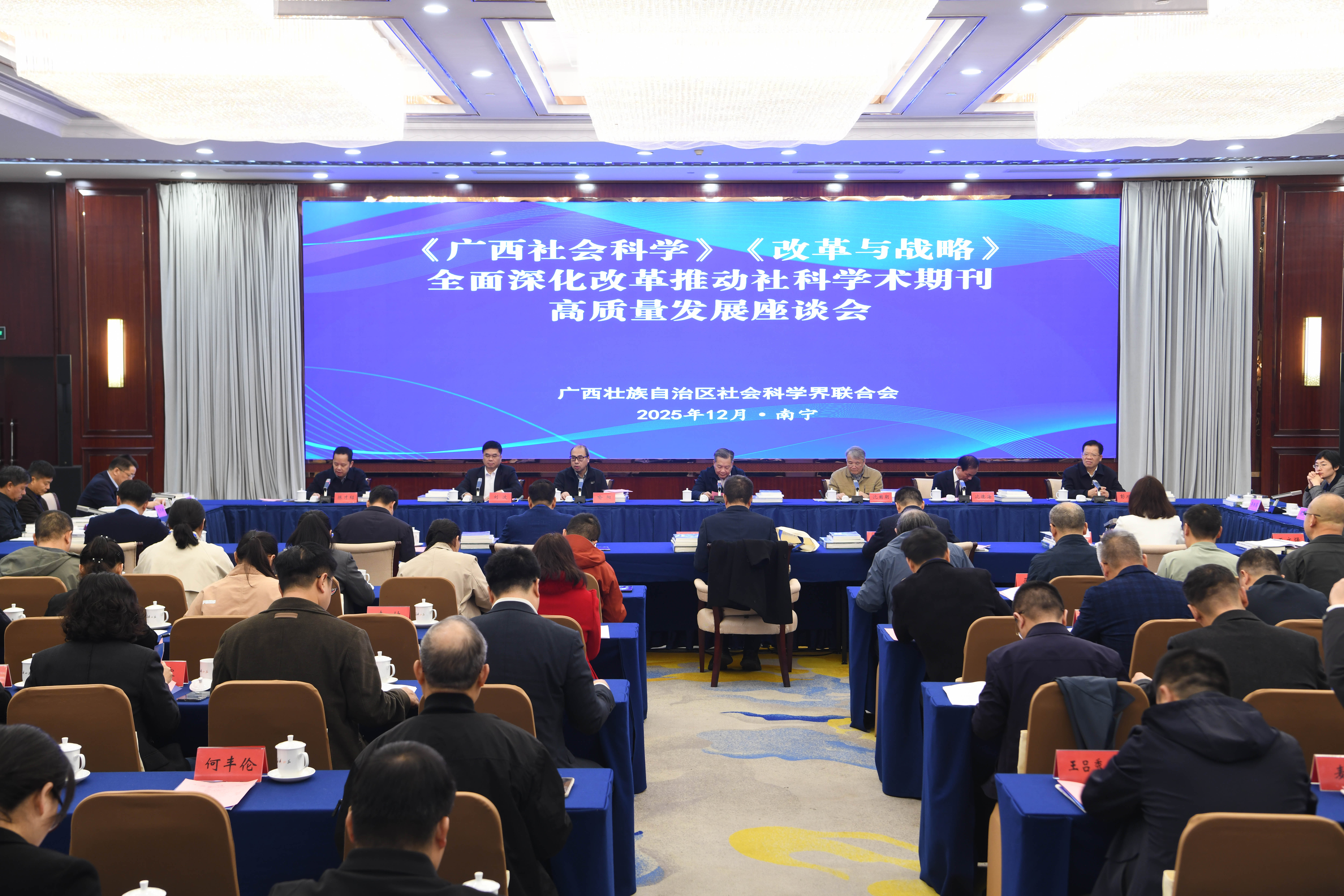 2025年12月30日,《广西社会科学》《改革与战略》全面深化改革推动社科学术期刊高质量发展座谈会在南宁市召开。会议回顾总结了两刊创刊四十年的发展历程和宝贵经验,围绕新时代社科学术期刊的高质量发展路径展开深入探讨,为谱写中国式现代化广西篇章贡献智慧与理论支撑。学校党委书记彭顺克出席座谈会并致辞。