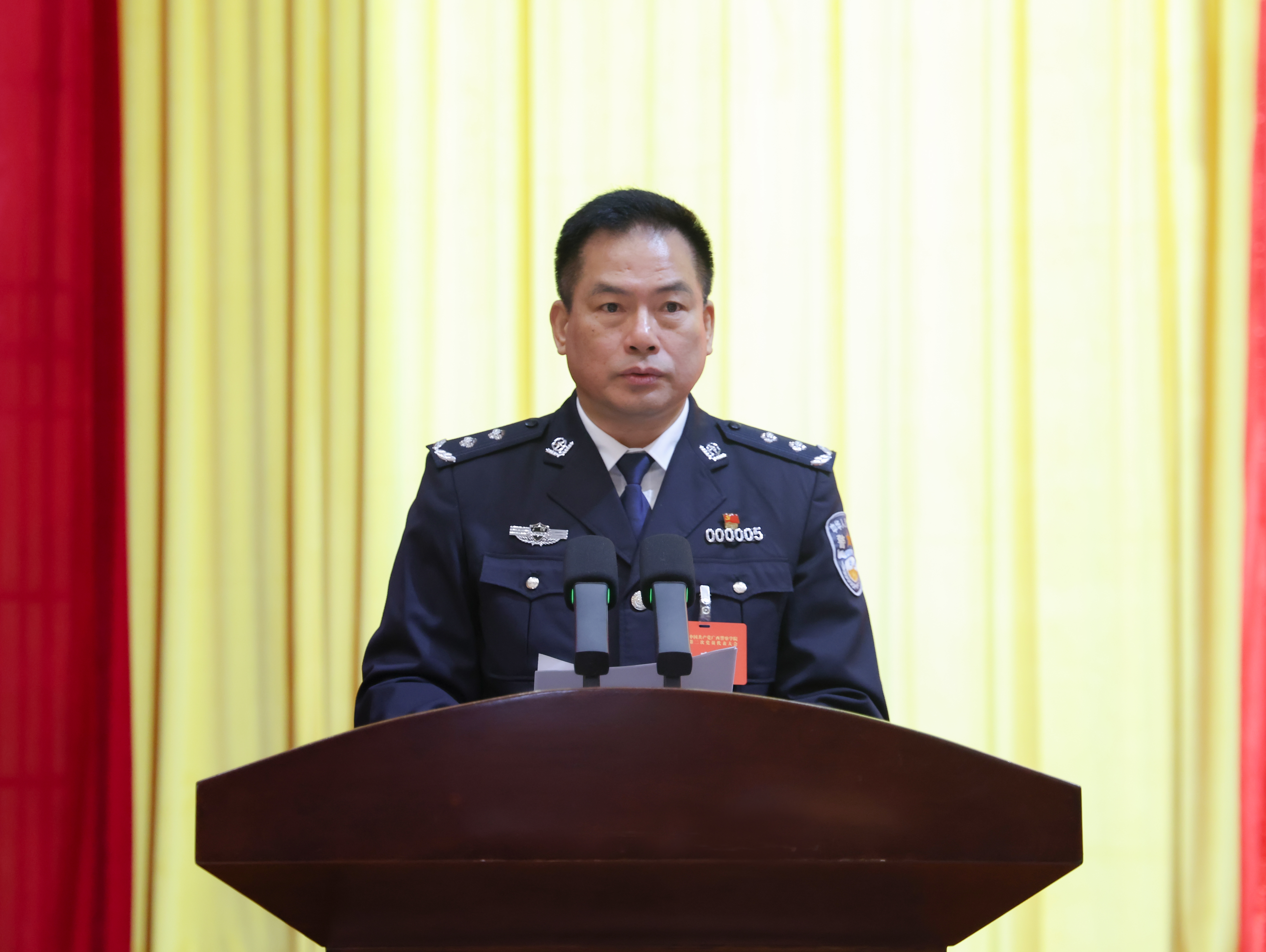 13日上午,中国共产党广西警察学院第二次党员代表大会隆重开幕。主会场气氛庄重热烈,主席台中央上方中国共产党党徽熠熠生辉,两侧十面红旗整齐排列,上方悬挂着“中国共产党广西警察学院第二次党员代表大会”的会标,会场悬挂着“改革实干勇担当 立德树人铸警魂 奋力谱写广西公安高等教育高质量发展新篇章”的条幅,振奋人心、催人奋进。