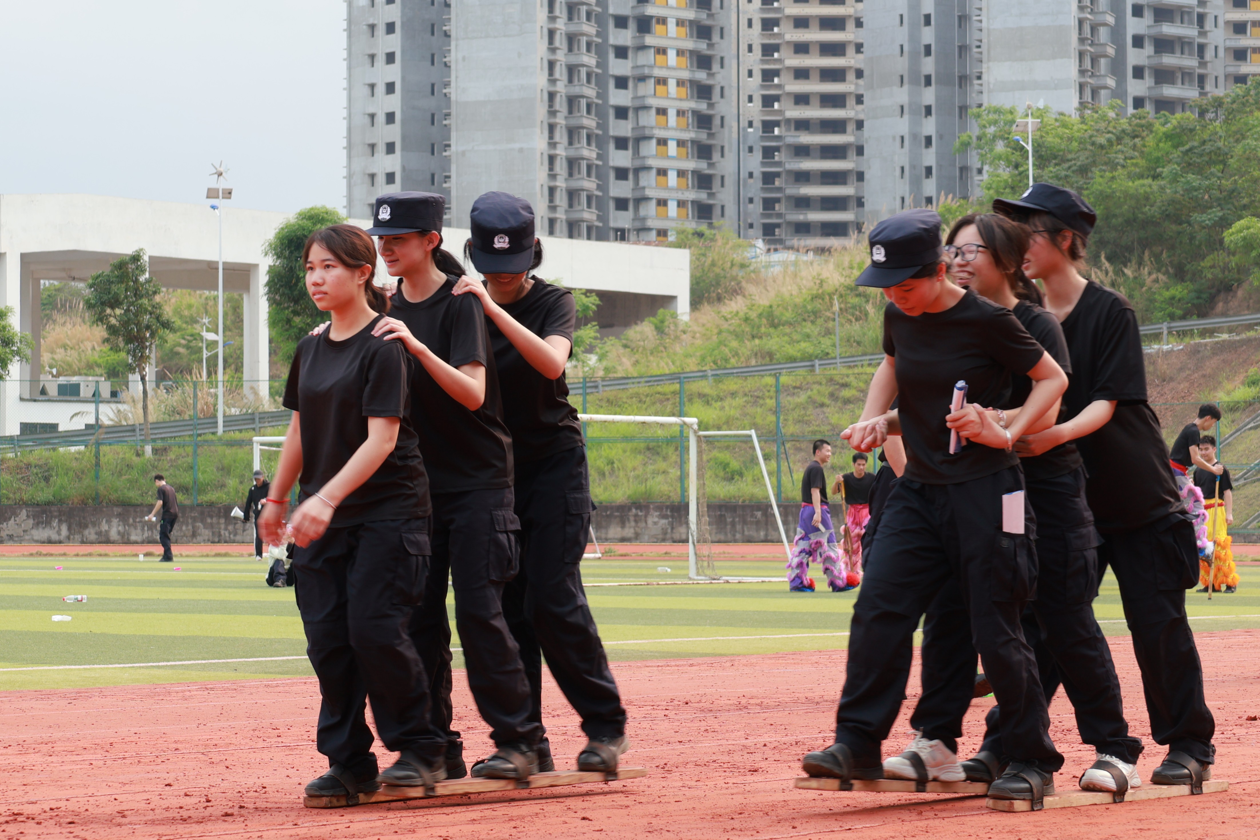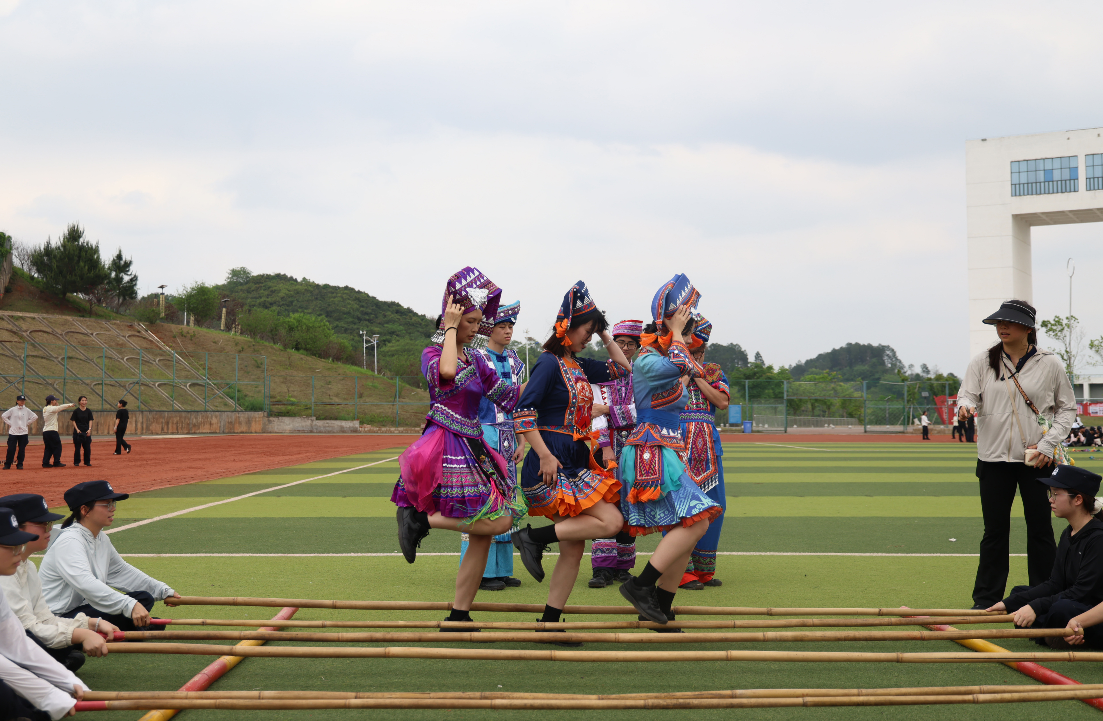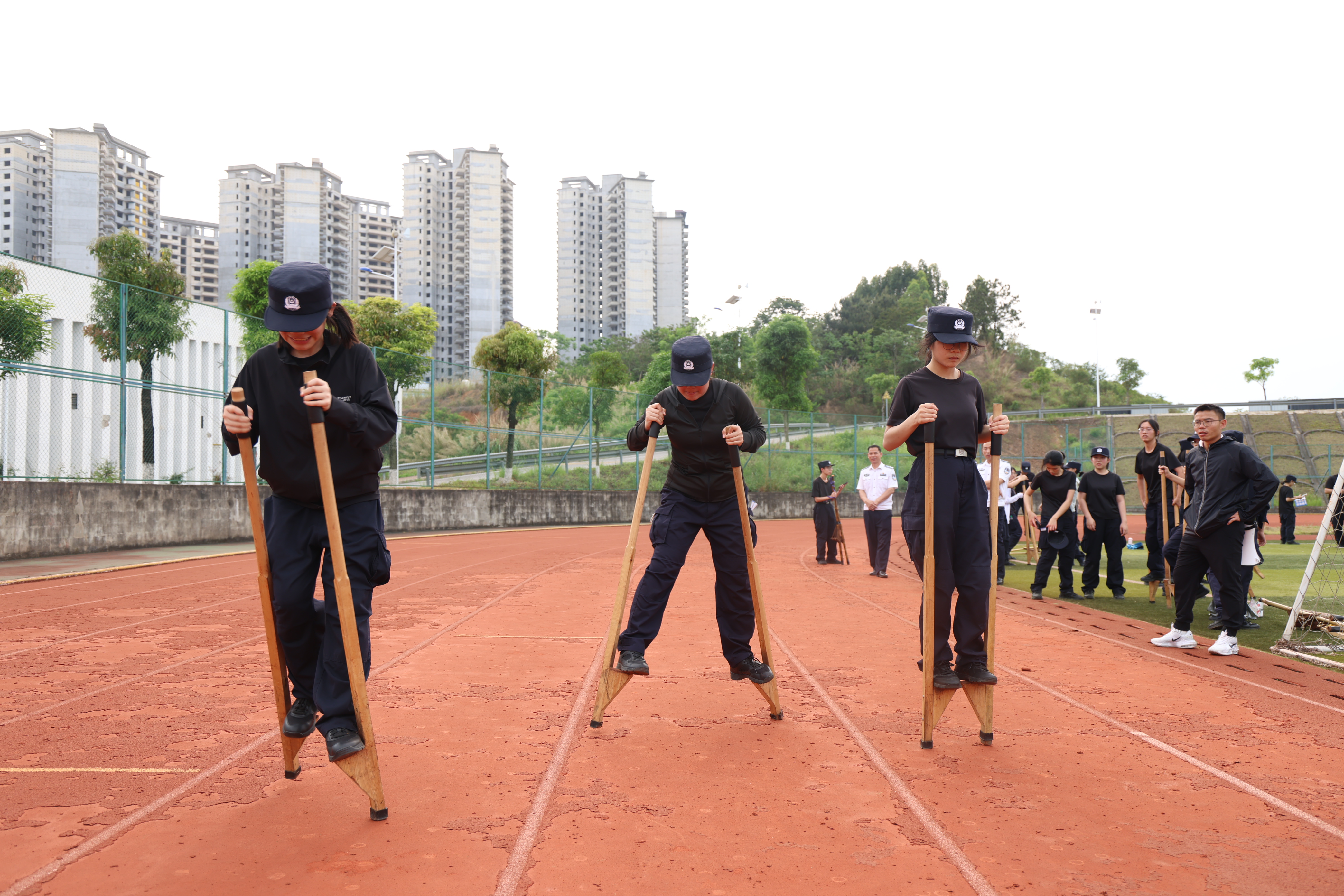 本次活动设置背篓绣球、高杆绣球、踩高跷、三人板鞋、竹竿舞、踢毽子六大特色体验项目,场地科学分区、秩序井然。活动分为班级有序体验与自由体验两个阶段,同学们在教师与学生裁判的组织引导下,踊跃参与、默契协作,在欢声笑语中感受民族体育乐趣,在协作比拼中增进民族团结情谊,充分展现了新时代警院学子朝气蓬勃、昂扬向上、纪律严明的精神面貌。