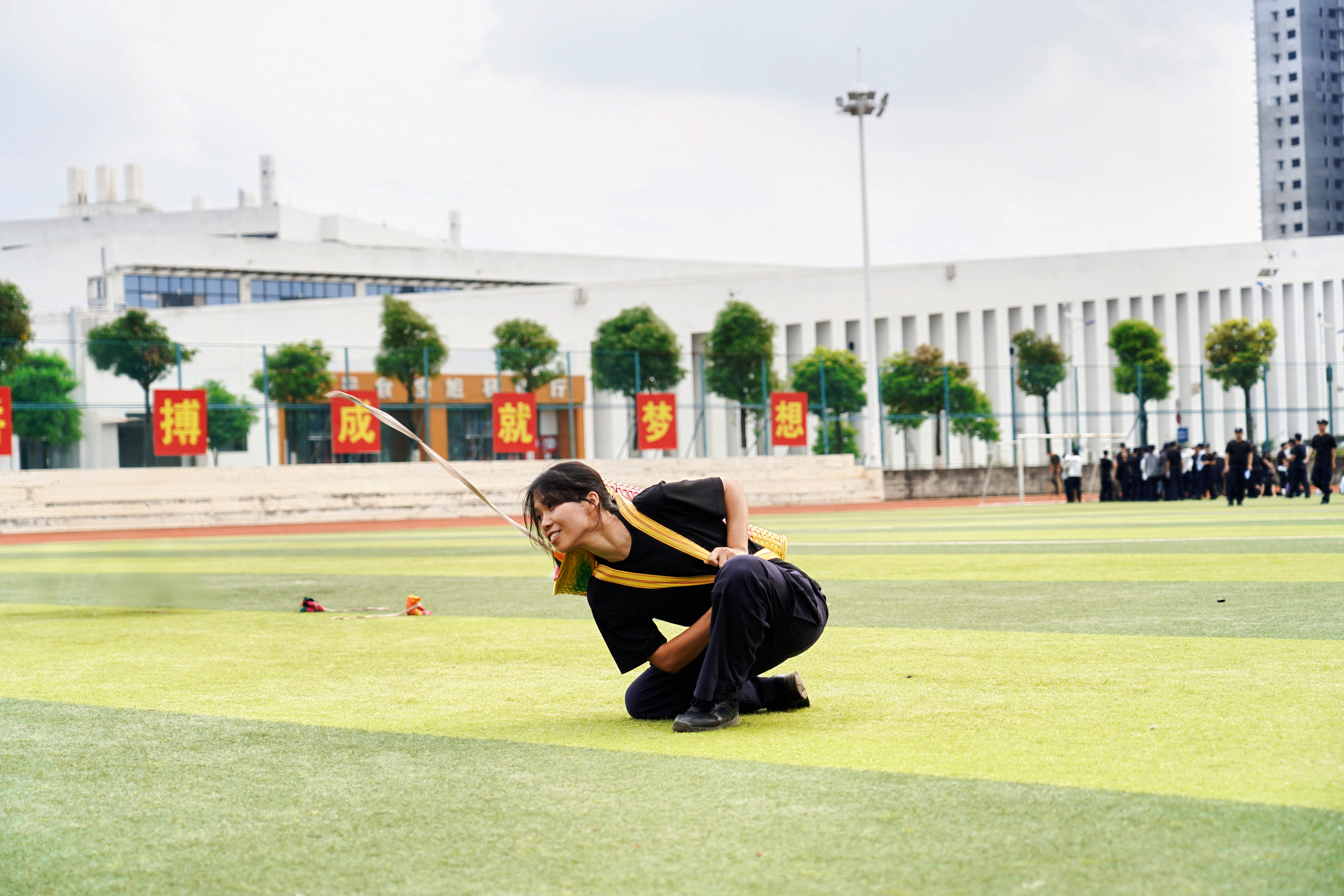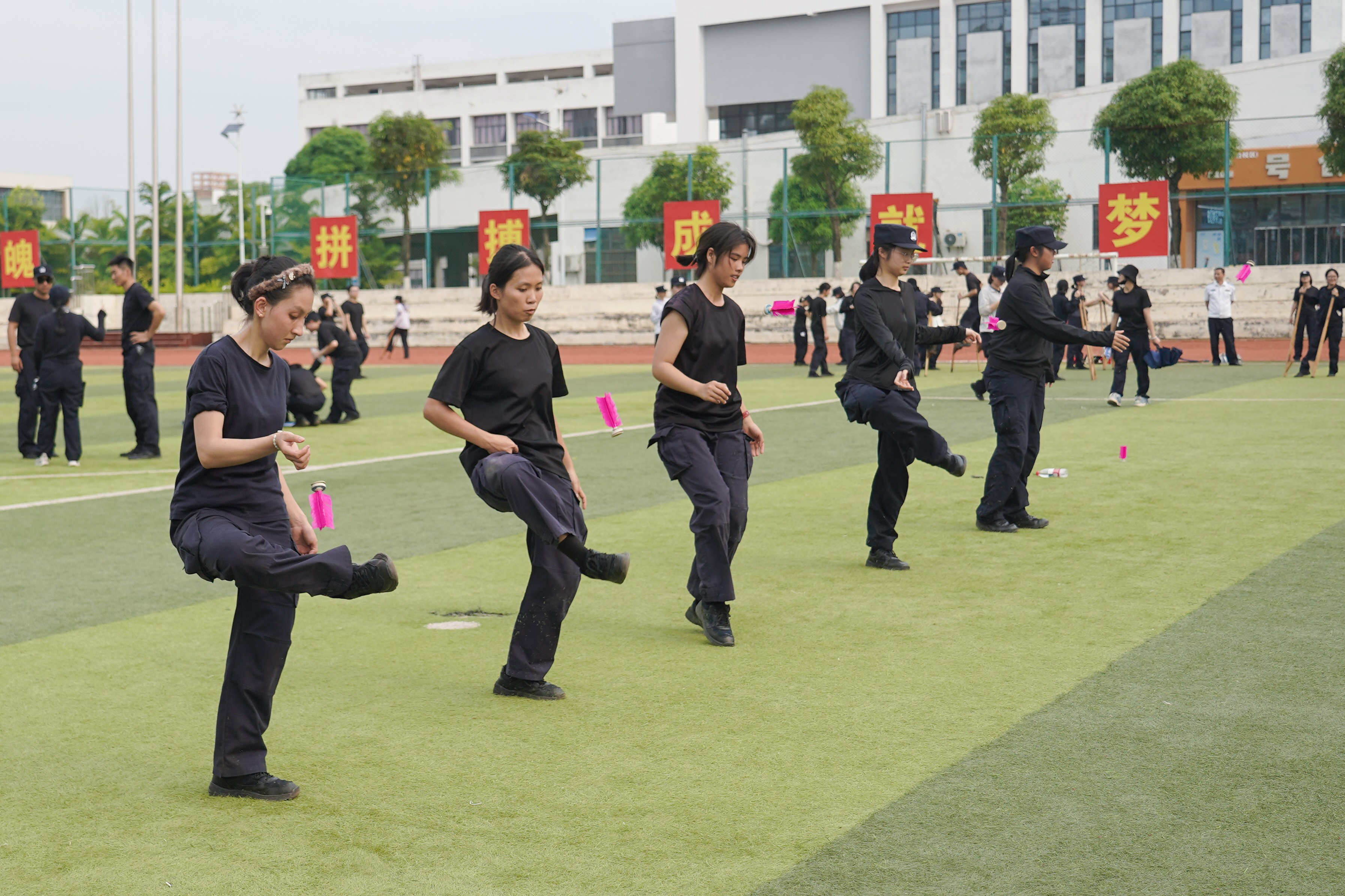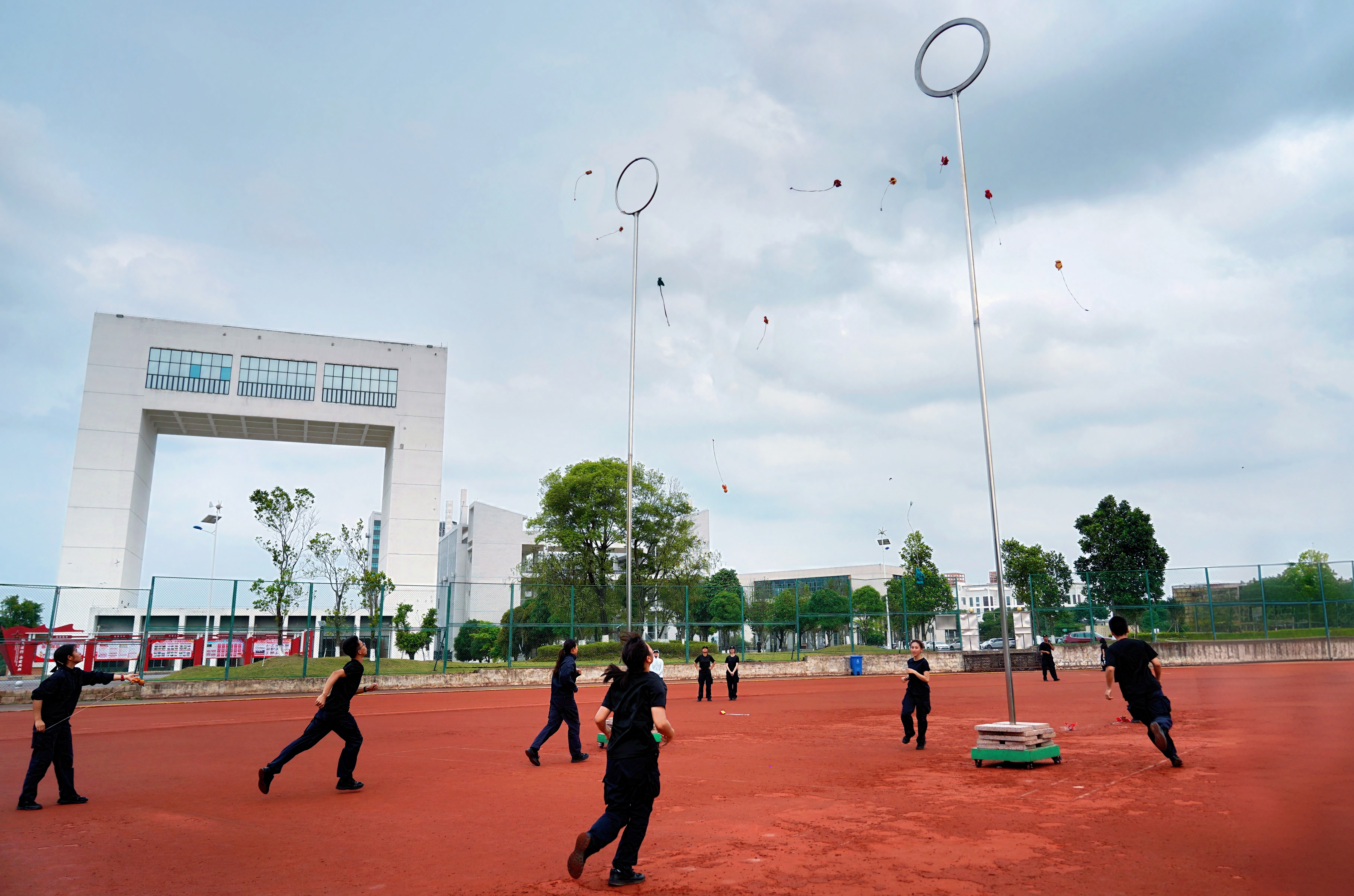 本次活动设置背篓绣球、高杆绣球、踩高跷、三人板鞋、竹竿舞、踢毽子六大特色体验项目,场地科学分区、秩序井然。活动分为班级有序体验与自由体验两个阶段,同学们在教师与学生裁判的组织引导下,踊跃参与、默契协作,在欢声笑语中感受民族体育乐趣,在协作比拼中增进民族团结情谊,充分展现了新时代警院学子朝气蓬勃、昂扬向上、纪律严明的精神面貌。