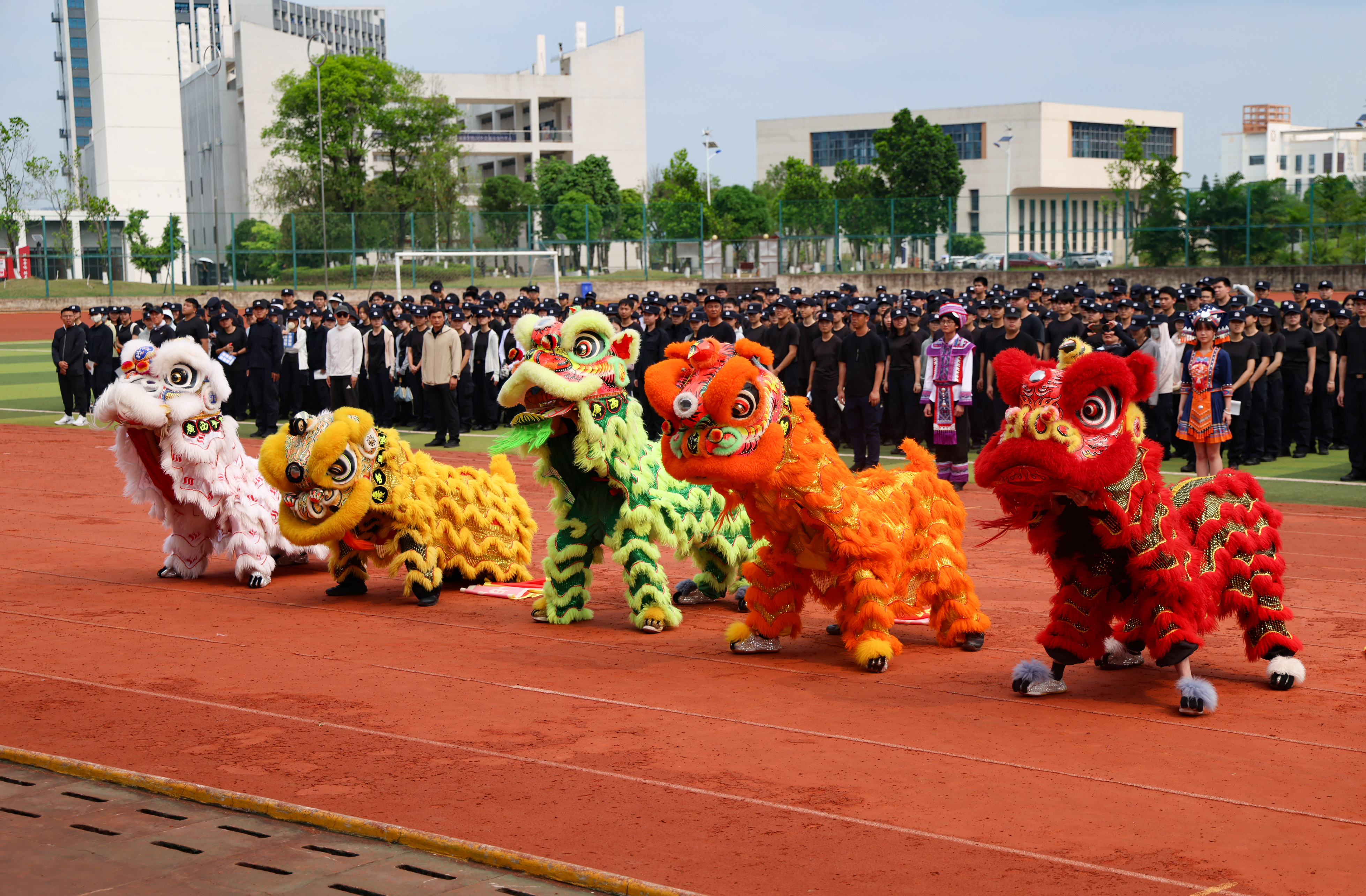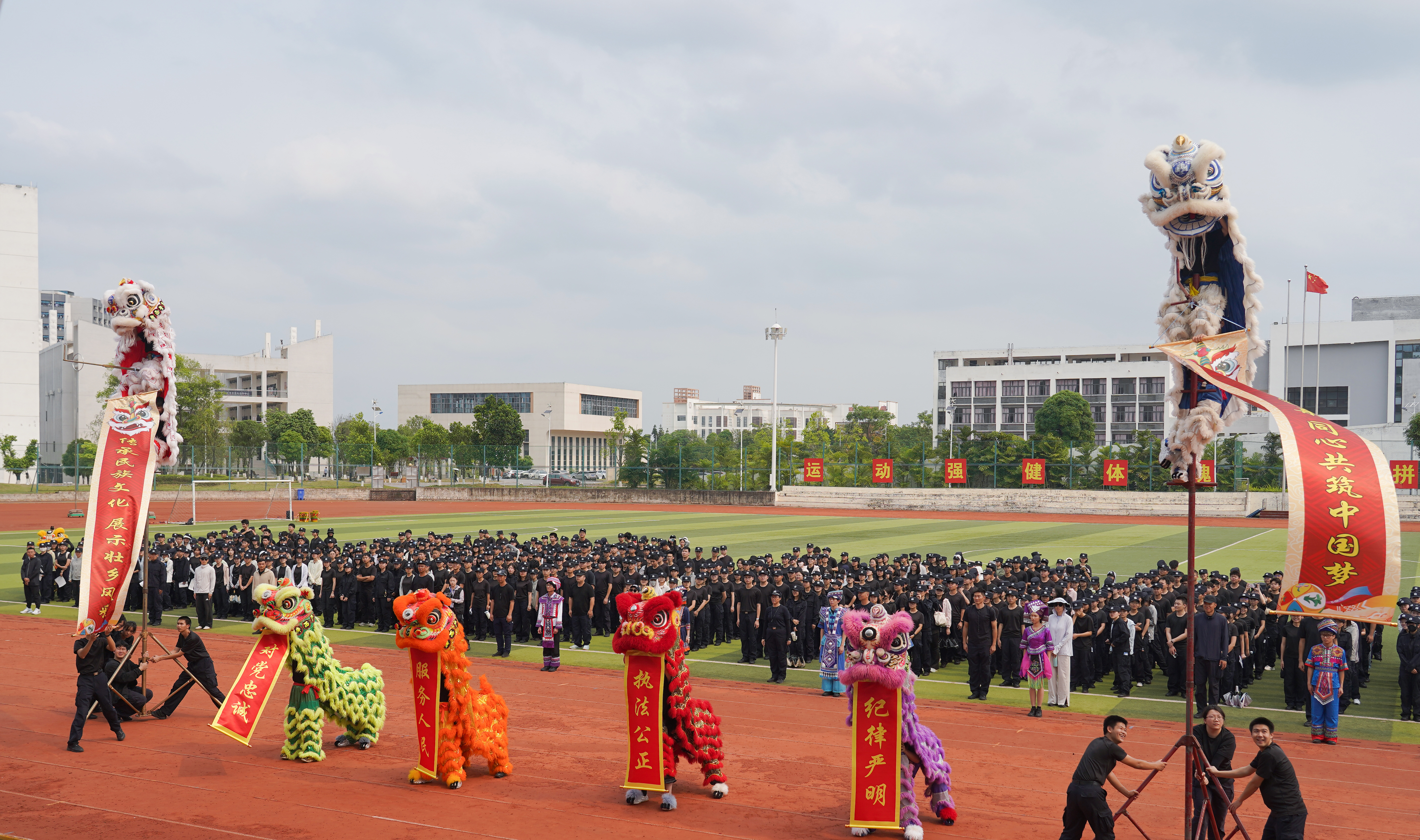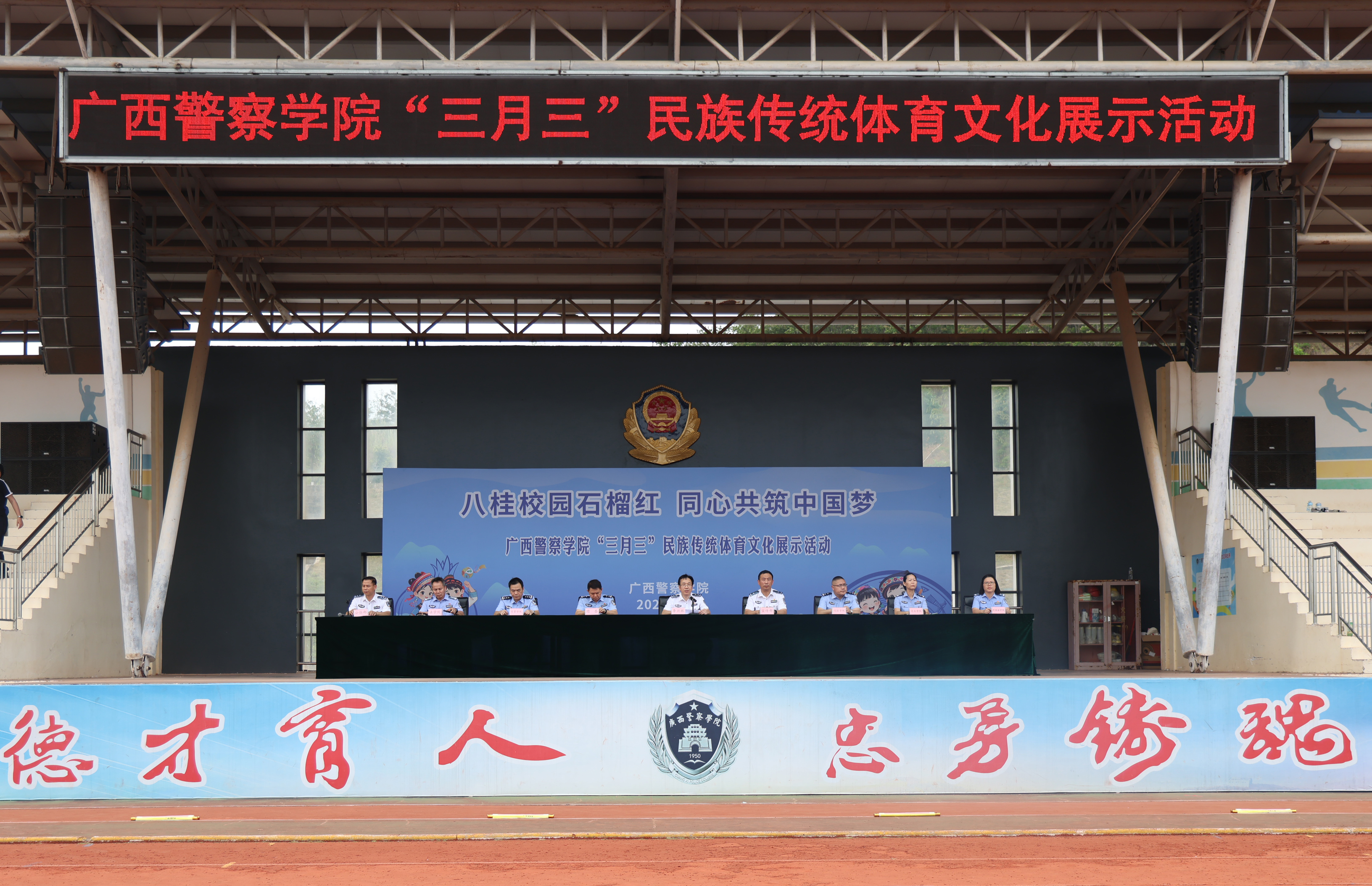 李兴林指出,“广西三月三” 是广西独具特色的民族传统节日,承载着深厚历史底蕴与灿烂民族文化,是中华民族文化宝库中的璀璨明珠。本次活动以“八桂校园石榴红 同心共筑中国梦” 为主题,“石榴红” 寓意各族儿女像石榴籽一样紧紧相拥、亲如一家。在警院校园里,各民族师生同学习、共生活、齐进步,正是民族团结的生动写照。举办此次活动,既是深入学习贯彻习近平总书记关于加强和改进民族工作的重要思想、关于体育的重要论述的具体举措,也是落实立德树人根本任务、发挥体育育人功能的重要载体,更是铸牢中华民族共同体意识、传承弘扬中华优秀传统文化、深化校园文化建设的生动实践。