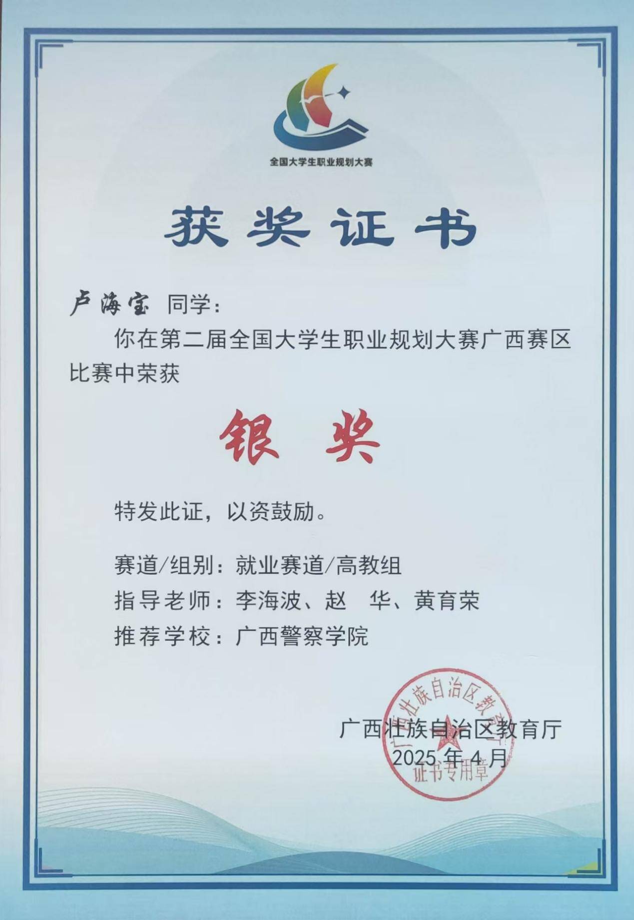 卢海宝同学获第二届全国大学生职业规划大赛广西赛区银奖