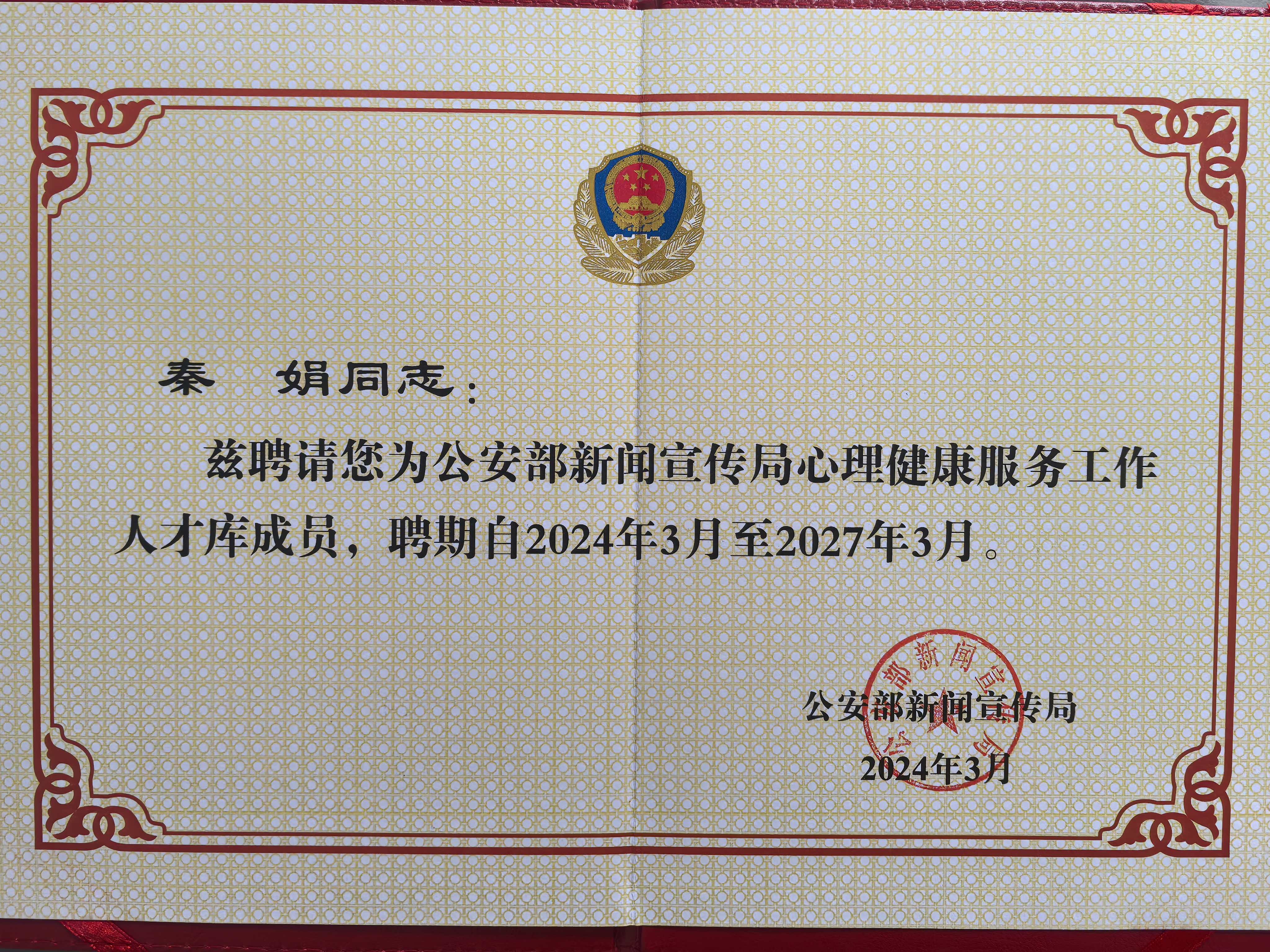 秦娟老师被聘为公安部新闻局心理健康服务工作人才库成员