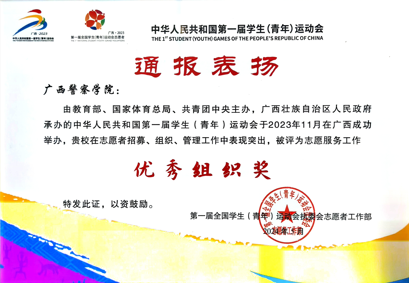 荣获第一届全国学生(青年)运动会优秀组织奖