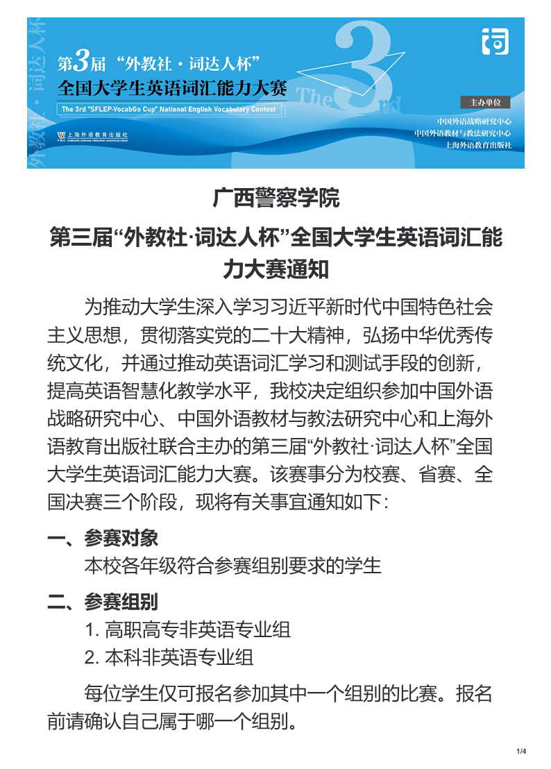 广西警察学院第三届“外教社·词达人杯”全国大学生英语词汇能力大赛通知