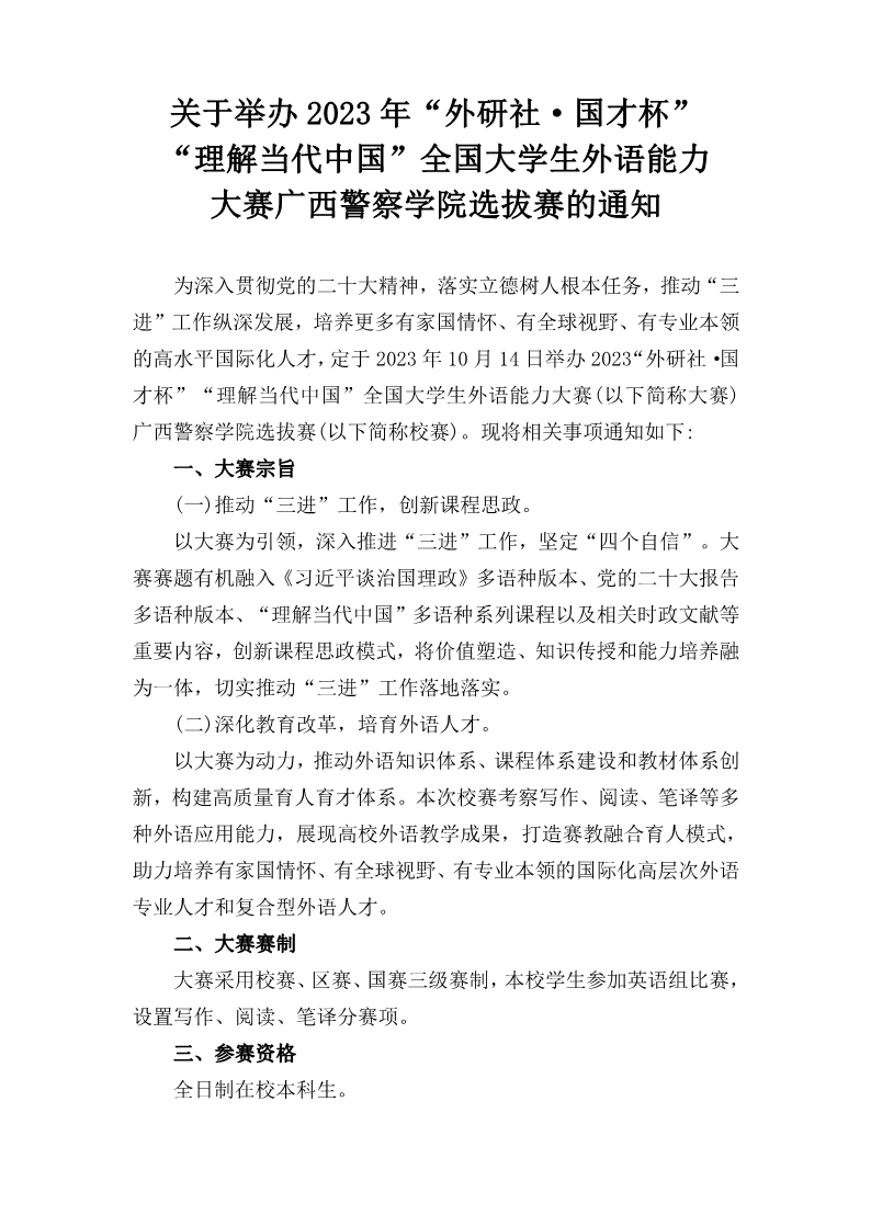 关于举办2023年“外研社·国才杯”“理解当代中国”全国大学生外语能力大赛广西警察学院选拔赛的通知 来源: 发布时间:2023-09-21 17:30:45 浏览次数: 次 【字体:小 大】 分享到: 【打印正文】