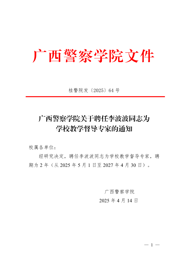 广西警察学院关于聘任左婧等同志为学校教学督导专家的通知