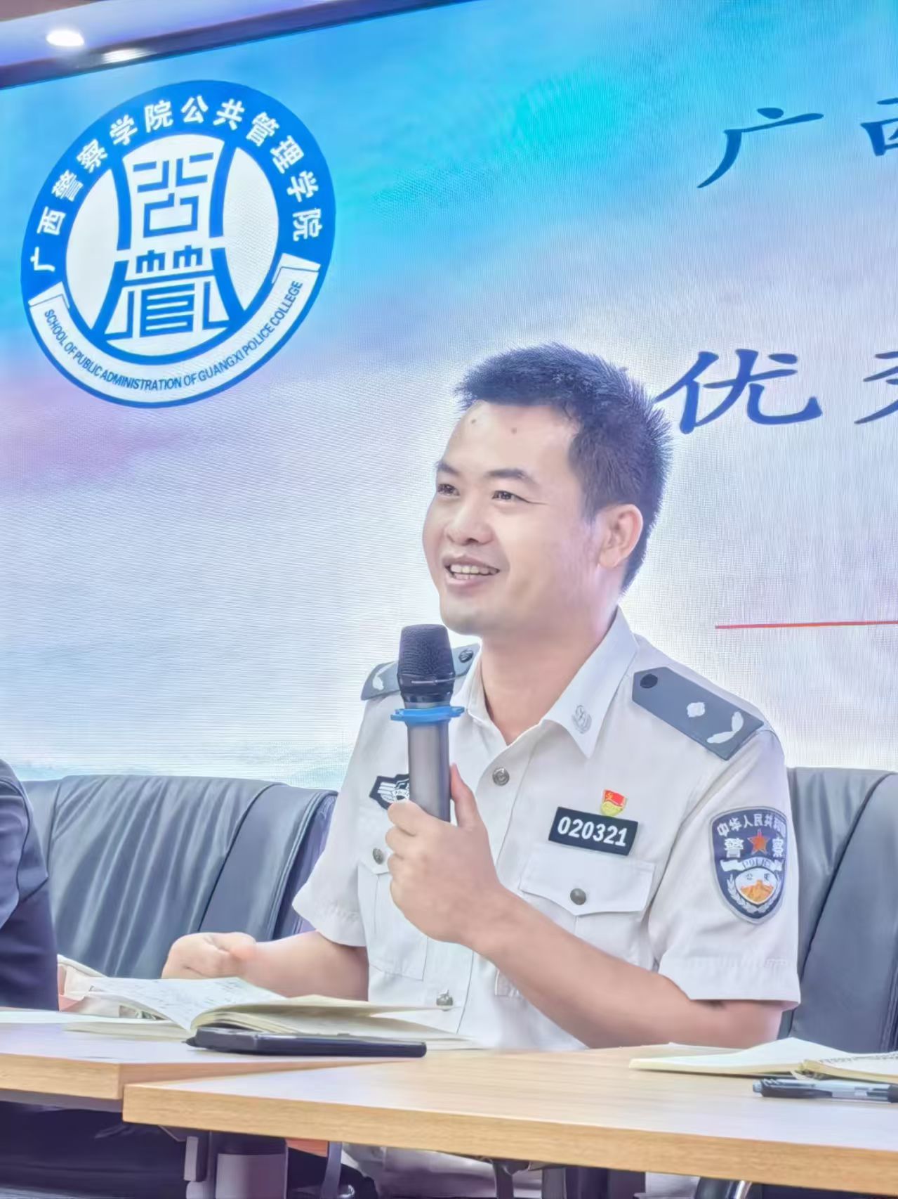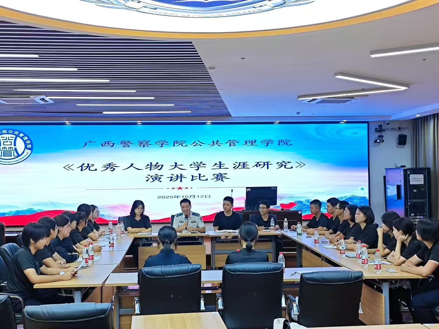 2025年10月12日,广西警察学院公共管理学院在五合校区二号实训楼401教室,成功举办“优秀人物大学生涯演讲比赛”。活动由学院主办,副院长农忠海任评委组组长,23城管郭莉青、24应管张庆锋组织,25届新生共27人参与,旨在通过演讲提升新生职业规划意识与综合表达能力。