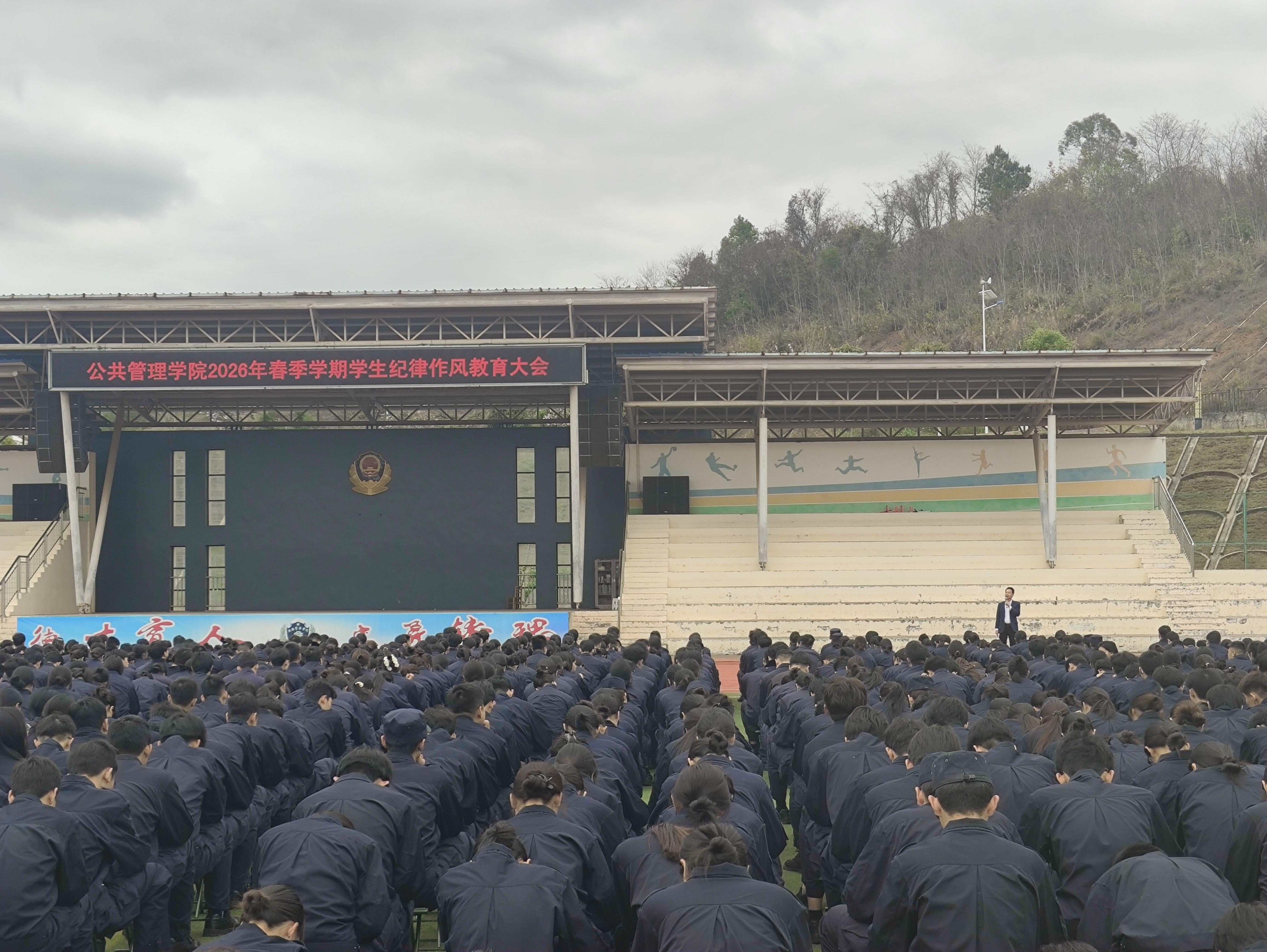 为深入贯彻公安院校警务化管理要求,强化学生纪律作风建设,引导学生迅速收心归位、以昂扬状态投入新学期学习训练,3月10日下午,公共管理学院在五合校区田径场召开2026年春季学期学生纪律作风教育大会。学院党总支副书记李海波主持会议,全体辅导员及在校学生参会。