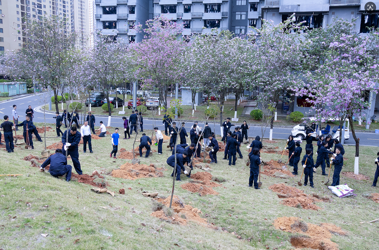 在活动现场,师生们并肩劳作,共植绿林。大家挥锹铲土、扶苗校准、培土压实、浇水灌溉,每一个环节都一丝不苟、有条不紊。老师们率先垂范,同学们干劲十足,现场秩序井然、氛围热烈,劳动的身影与初绽的新绿相映成趣,迎风挺立的苗木为春日警院注入了蓬勃生机。
