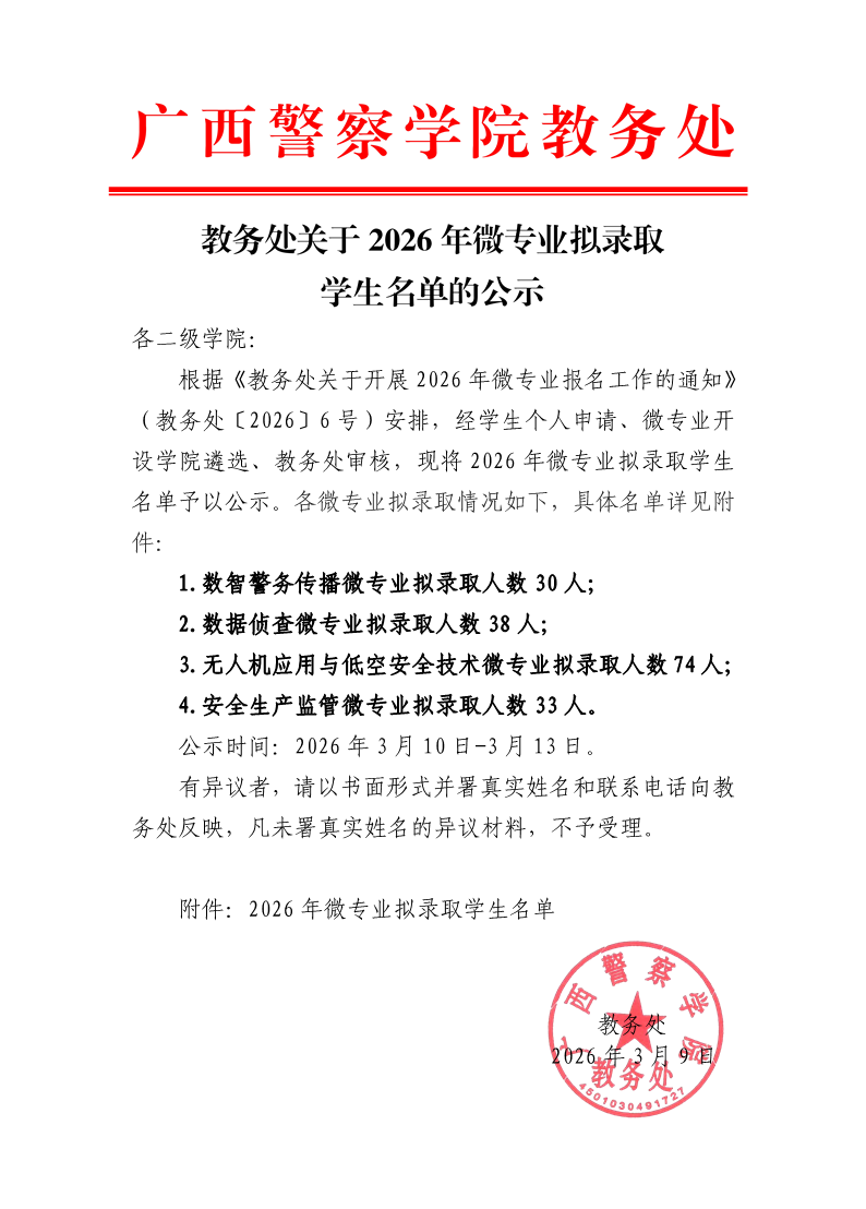 教务处关于2026年微专业拟录取名单的公示 来源: 发布时间:2026-03-10 10:56:02 浏览次数: 次 【字体:小 大】 广西警察学院2026年微专业拟录取学生名单.xlsx 分享到: 【打印正文】
