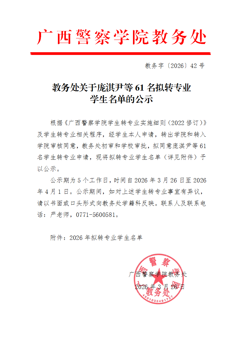 教务处关于庞淇尹等61名拟转专业学生名单的公示 来源: 发布时间:2026-03-26 16:35:48 浏览次数: 次 【字体:小 大】 附件:2026年拟转专业学生名单.xls 分享到: 【打印正文】