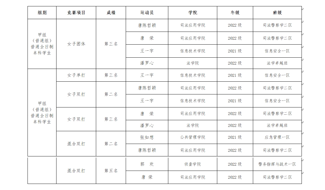 喜报:我校匹克球队在2024年中国大学生匹克球挑战赛中取得佳绩 来源: 发布时间:2024-12-02 09:55:49 浏览次数: 次 【字体:小 大】 2024年11月25至29日,2024年中国大学生匹克球挑战赛在珠海横琴粤澳深度合作区举行。该赛事是我国首次举办的国家级高校匹克球比赛,由中国学生体育联合会主办、横琴粤澳深度合作区民生事务局支持,共有来自清华大学、澳门大学、西北工业大学、广西大学等57所高校近600名领队、教练和运动员参赛。经过紧张激烈的角逐,我校匹克球代表队最终成绩为: 编辑:钟 声 审核:吴 地 签发:蓝照光 分享到: 【打印正文】