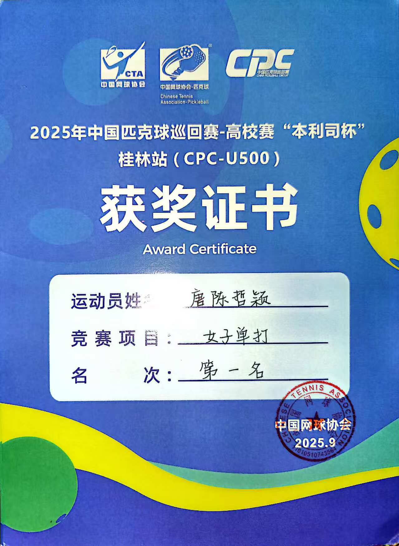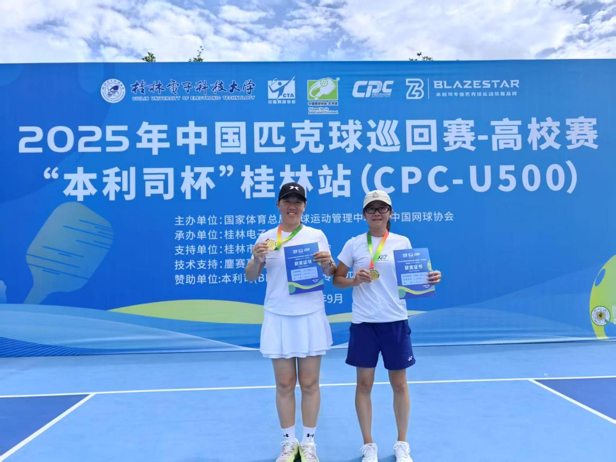2025年9 月 21 日,2025 中国匹克球巡回赛高校赛 “本利司杯” 桂林站(CPC-500)在桂林电子科技大学落幕。我院师生代表队在此次赛事中凭借精湛的技艺和顽强的拼搏精神,斩获三项冠军、一项亚军。