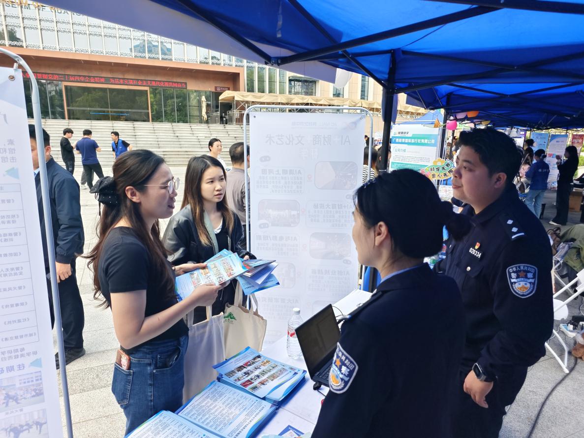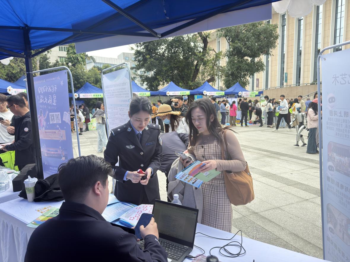 宣传内容包含红色主题国防教育、警犬技能展示、警务内务整理以及警队列队展示等,生动地展现出纪律严明、昂扬向上的警营风貌,吸引了众多老师和家长驻足咨询。