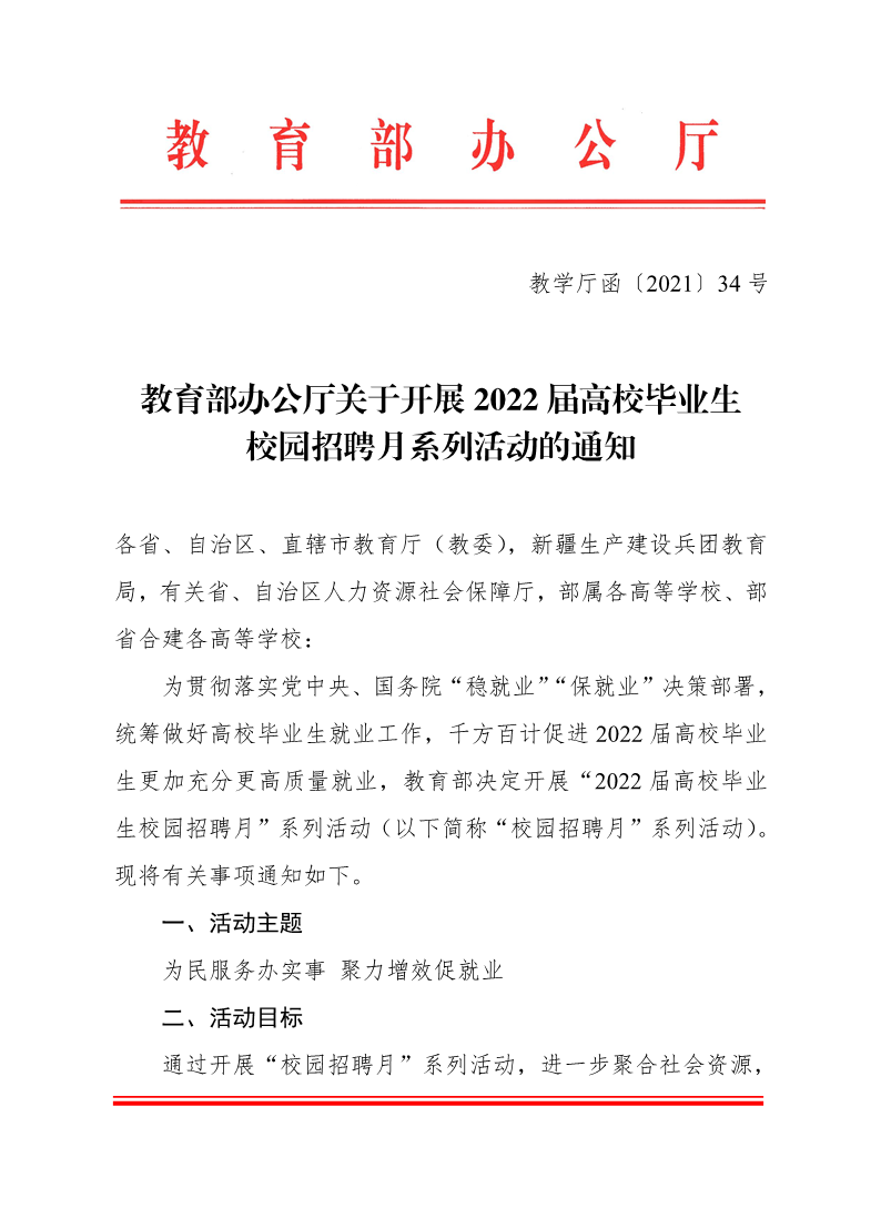 教育部办公厅关于开展2022届高校毕业生校园招聘月系列活动的通知