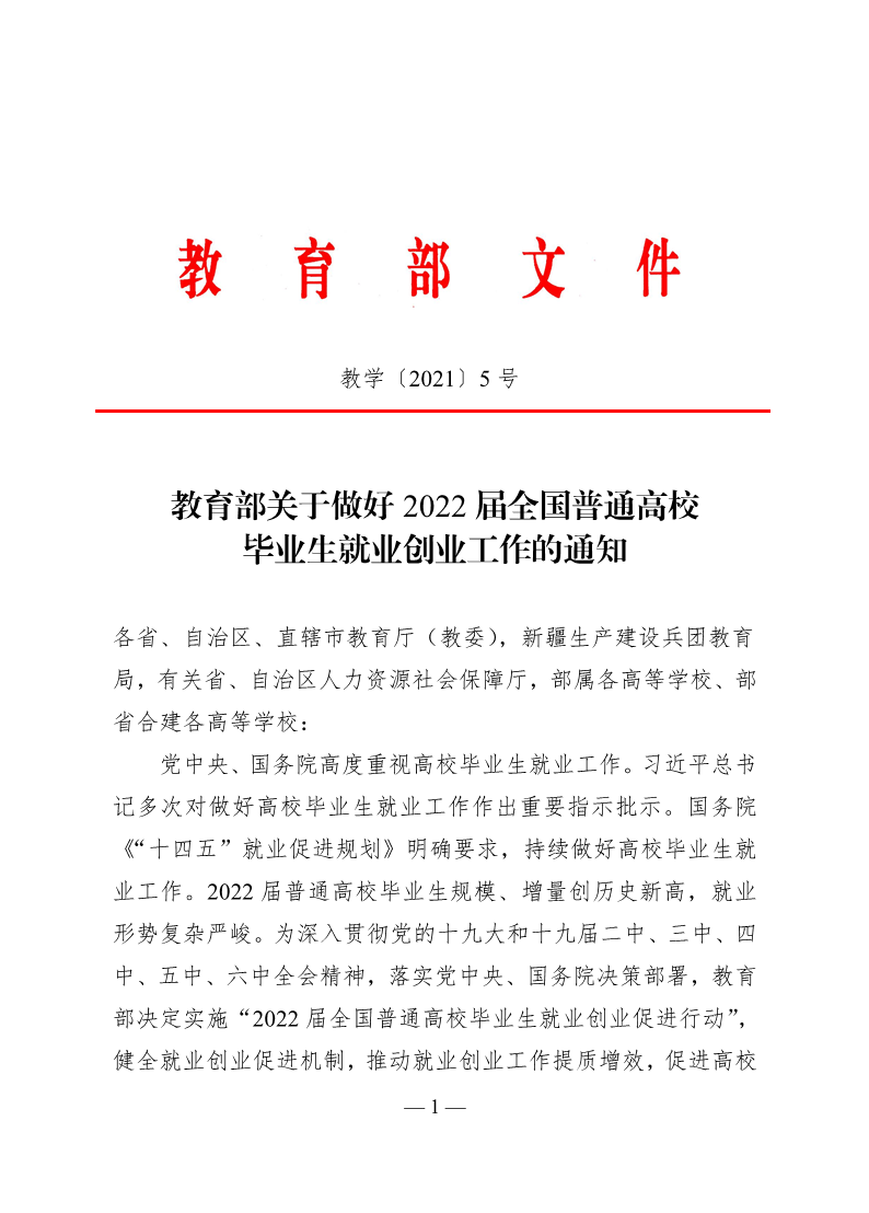 教育部关于做好2022届全国普通高校毕业生就业创业工作的通知