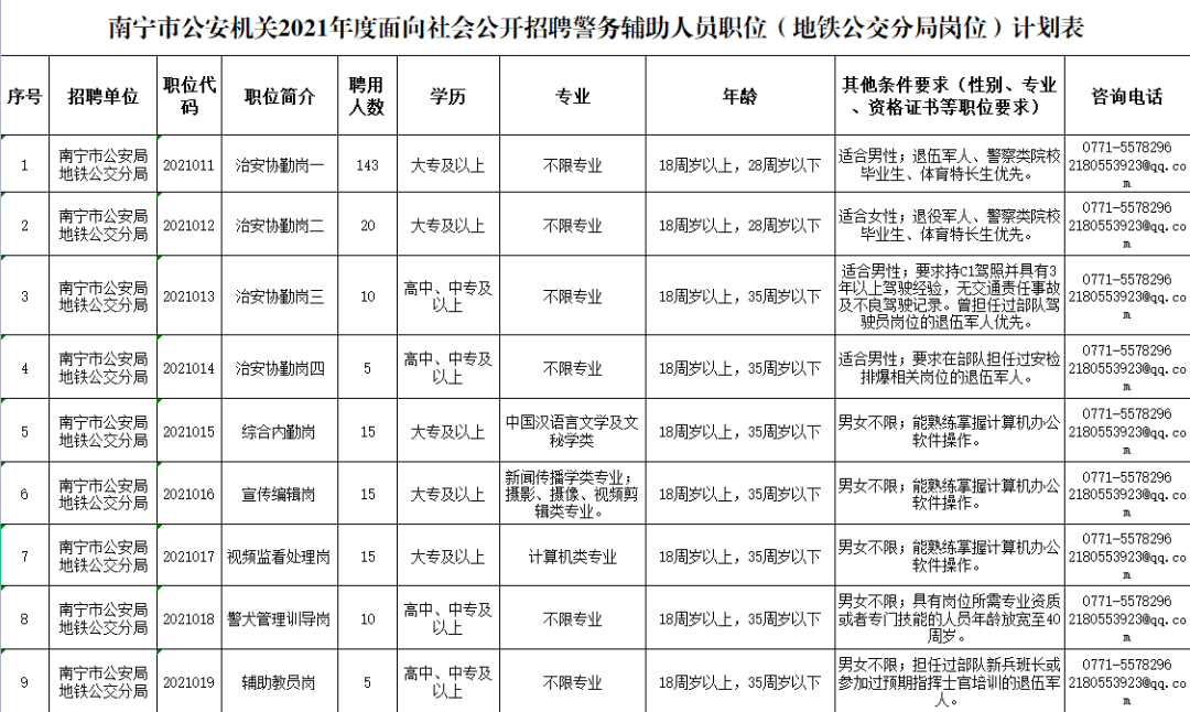 南宁市公安局2021年度面向社会公开招聘警务辅助人员(地铁公交分局岗位)公告