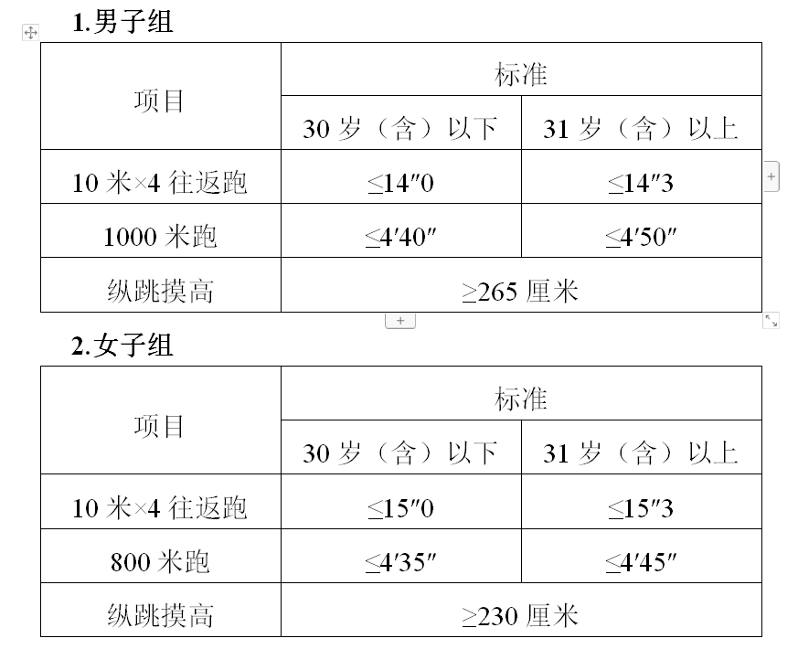 (六)体能测评项目和标准。参照《关于印发公安机关录用人民警察体能测评项目和标准(暂行)的通知》(人社部发〔2011〕48号)的项目及测试规则,结合《公安民警体育锻炼达标手册》成绩标准,体能测评的项目和标准如下: