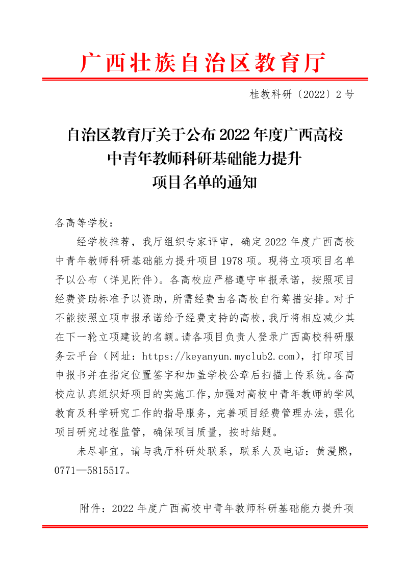 自治区教育厅关于公布2022年度广西高校中青年教师科研基础能力提升项目名单的通知