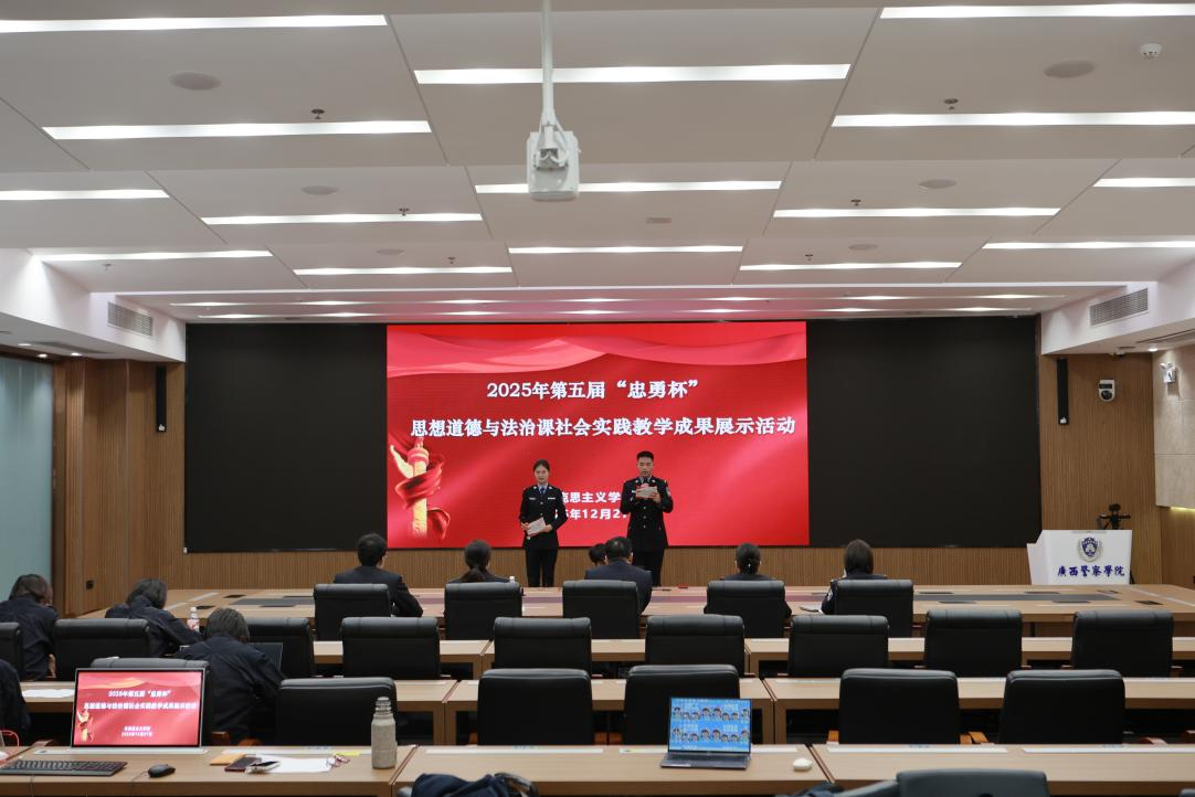 为深入学习贯彻党的二十届四中全会精神,牢牢把握立德树人根本任务,引导青年学子坚定理想信念、铸牢忠诚警魂。12月27日,由马克思主义学院主办的广西警察学院第五届“忠勇杯”思想道德与法治课社会实践教学展示活动暨第一届“铸魂杯”中华民族共同体概论课社会实践教学展示活动在仙葫校区与五合校区同步举行。来自全校的上千名师生现场观摩比赛。