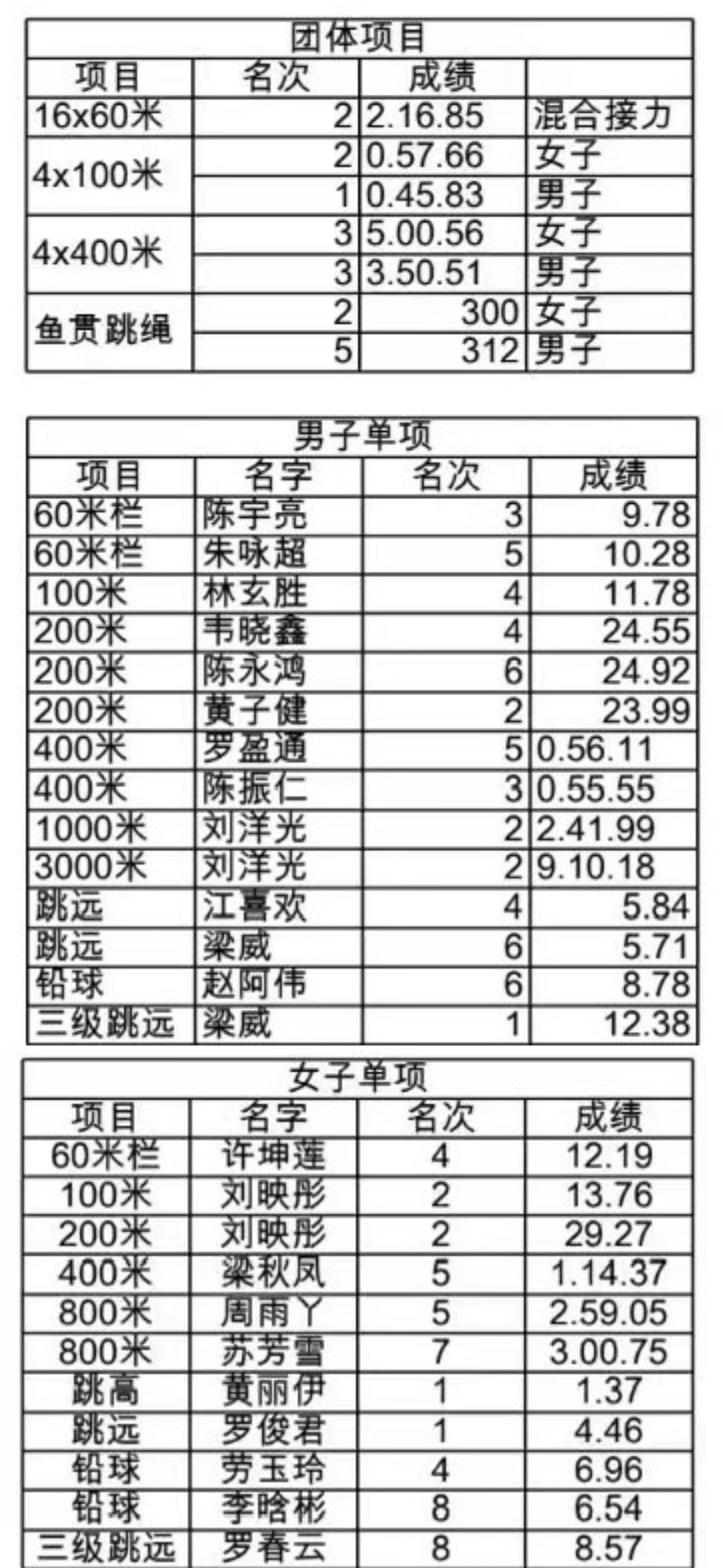 赛事捷报频传,多项纪录被打破。田径赛场上,刘洋光在男子1000米、3000米项目中双双刷新校运会纪录;杨翠萍勇夺女子3000米冠军并创造新纪录;梁威、罗俊君分获三级跳远男、女组第一名;黄丽伊在女子跳高项目中摘得桂冠。集体项目中,16×60米混合接力打破校纪录,男子4×100米接力蝉联第一,展现出强劲的团队实力。