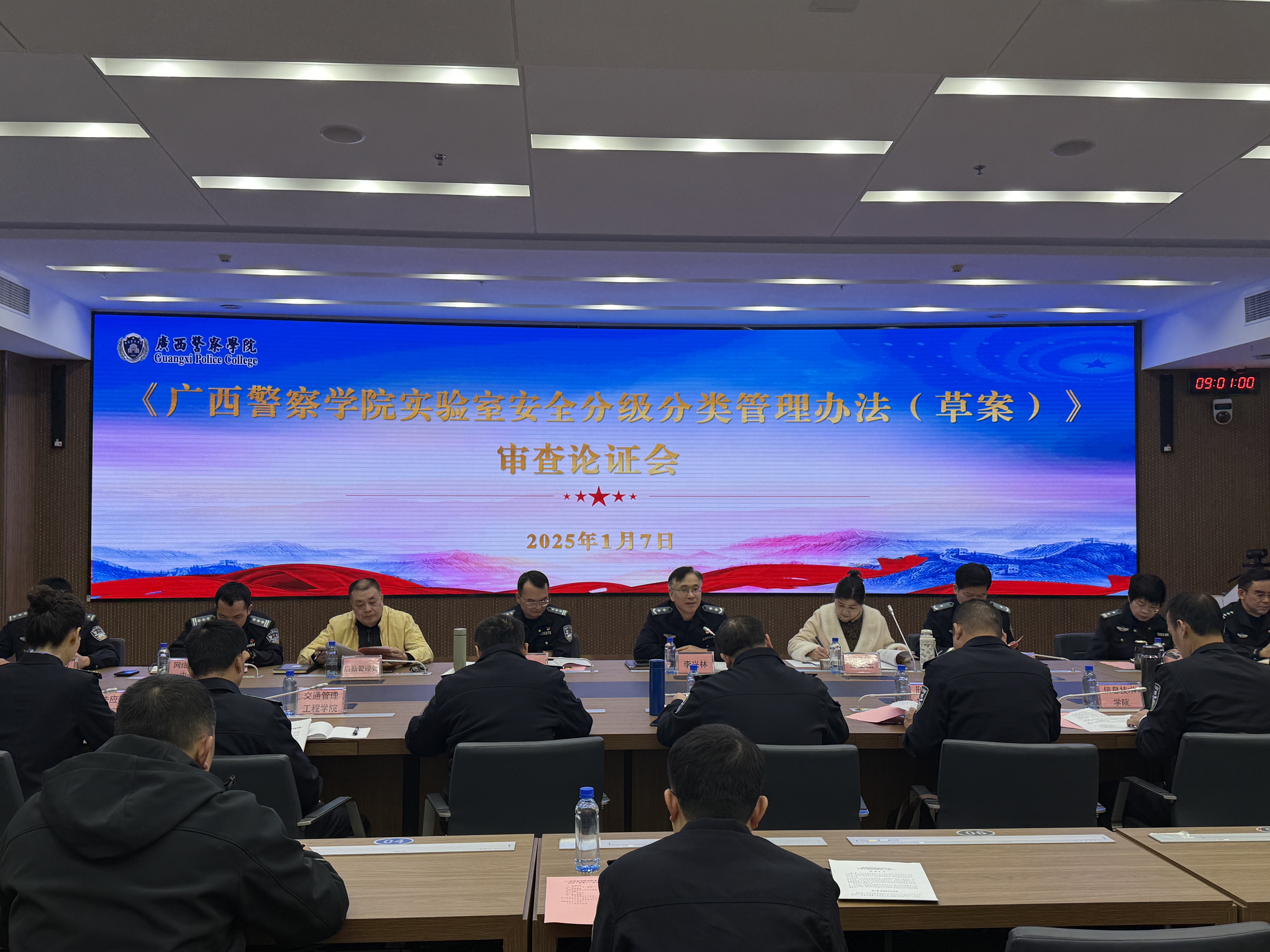 2025年1月7日上午,《广西警察学院实验室安全分级分类管理办法(草案)》审查论证会在仙葫校区智慧公安研训基地召开,会议由副校长李兴林主持。