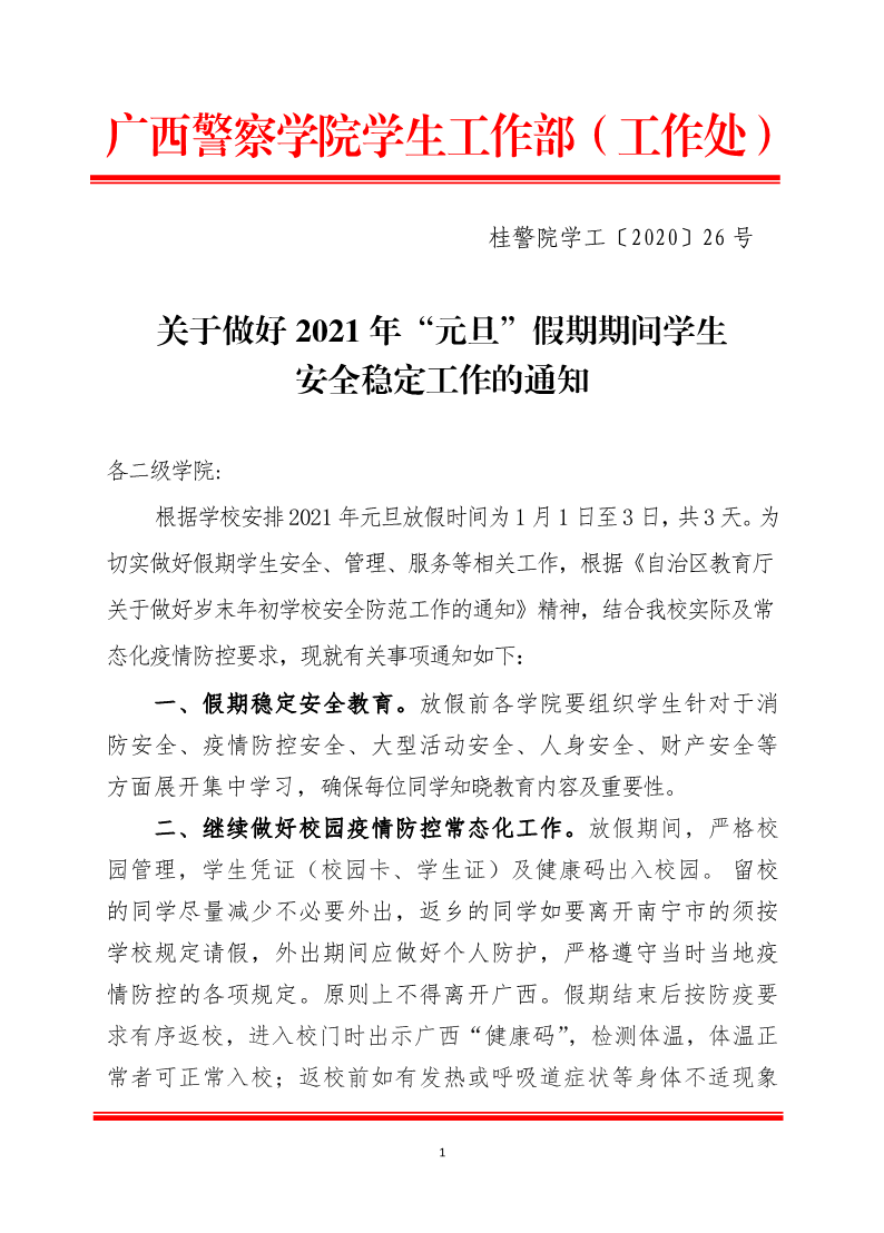 关于做好2021年“元旦”假期期间学生安全稳定工作的通知