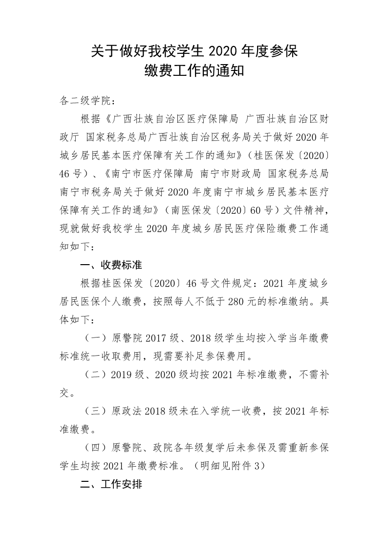 关于做好我校学生2020年参保缴费工作的通知 来源: 发布时间:2020-11-16 11:20:54 浏览次数: 次 【字体:小 大】 附件1:广西壮族自治区医疗保障局 广西壮族自治区财政厅 国家税务总局广西壮族自治区税务局关于做好2020年城乡居民基本医疗保障有关工作的通知(桂医保发〔2020〕46号).pdf附件2:《南宁市医疗保障局 南宁市财政局 国家税务总局南宁市税务局关于做好2020年度南宁市城乡居民基本医疗保障有关工作的通知》(南医保发〔2020〕60号).pdf附件5: 广西警察学院补交2021年医保费用缴费须知.pdf附件6:学生放弃在校参保承诺书.pdf 分享到: 【打印正文】