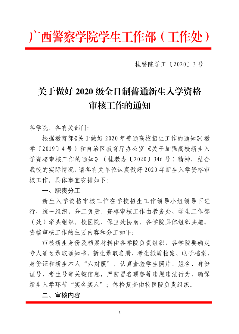 广西警察学院关于做好2020级全日制普通新生入学资格审核工作的通知 来源: 发布时间:2020-10-22 11:40:52 浏览次数: 次 【字体:小 大】 附件1:广西警察学院2020级新生自动放弃入学资格汇总表.pdf附件2:广西警察学院2020级全日制普通新生入学资格审核情况反馈表.pdf 分享到: 【打印正文】