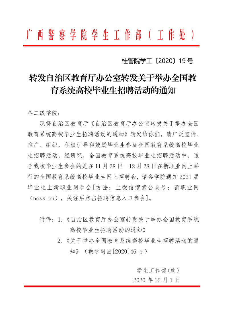 转发自治区教育厅办公室转发关于举办全国教育系统高校毕业生招聘活动的通知 来源: 发布时间:2020-12-01 07:50:15 浏览次数: 次 【字体:小 大】 附件1.《自治区教育厅办公室转发关于举办全国教育系统高校毕业生招聘活动的通知》.pdf附件2.《关于举办全国教育系统高校毕业生招聘活动的通知》(教学司函[2020]46号).pdf 分享到: 【打印正文】