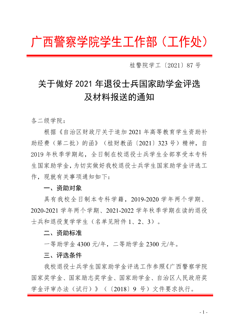 关于做好2021年退役士兵国家助学金评选和材料报送的通知 来源: 发布时间:2021-11-29 15:05:07 浏览次数: 次 【字体:小 大】 附件4:退役士兵国家助学金申请表.pdf附件5 XXXX学年退役士兵国家助学金汇总表.pdf 分享到: 【打印正文】