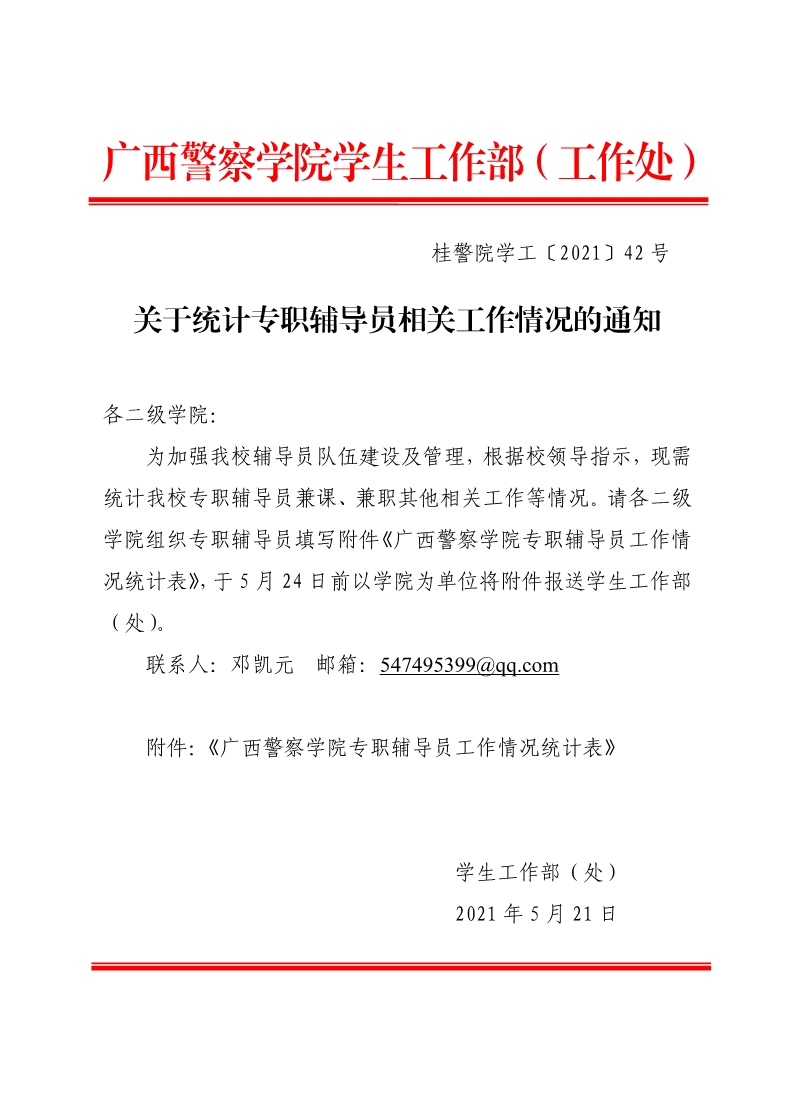关于统计专职辅导员相关工作情况的通知 来源: 发布时间:2021-05-21 15:10:07 浏览次数: 次 【字体:小 大】 附件:广西警察学院专职辅导员工作情况统计表.pdf 分享到: 【打印正文】