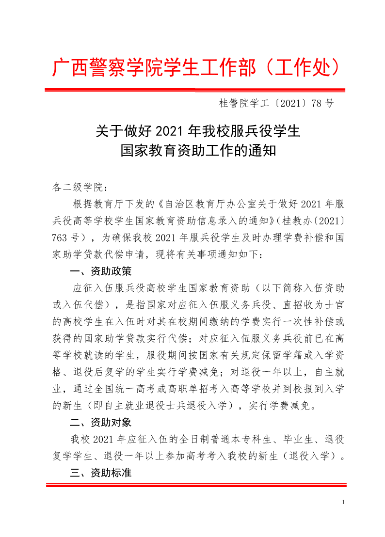 关于做好2021年我校服兵役学生国家教育资助工作的通知 来源: 发布时间:2021-11-01 15:00:52 浏览次数: 次 【字体:小 大】 附件1: 应征入伍服兵役高等学校学生国家教育资助申请表Ⅰ.pdf附件2: 应征入伍服兵役高等学校学生国家教育资助申请表Ⅱ.pdf附件3: 国家助学贷款一次性还款计划书.pdf 分享到: 【打印正文】