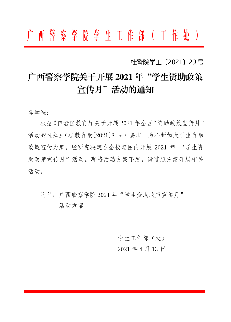 广西警察学院关于开展2021年“学生资助政策宣传月”活动的通知 来源: 发布时间:2021-04-13 15:00:04 浏览次数: 次 【字体:小 大】 附件:广西警察学院2021年“学生资助政策宣传月”活动方案.pdf 分享到: 【打印正文】