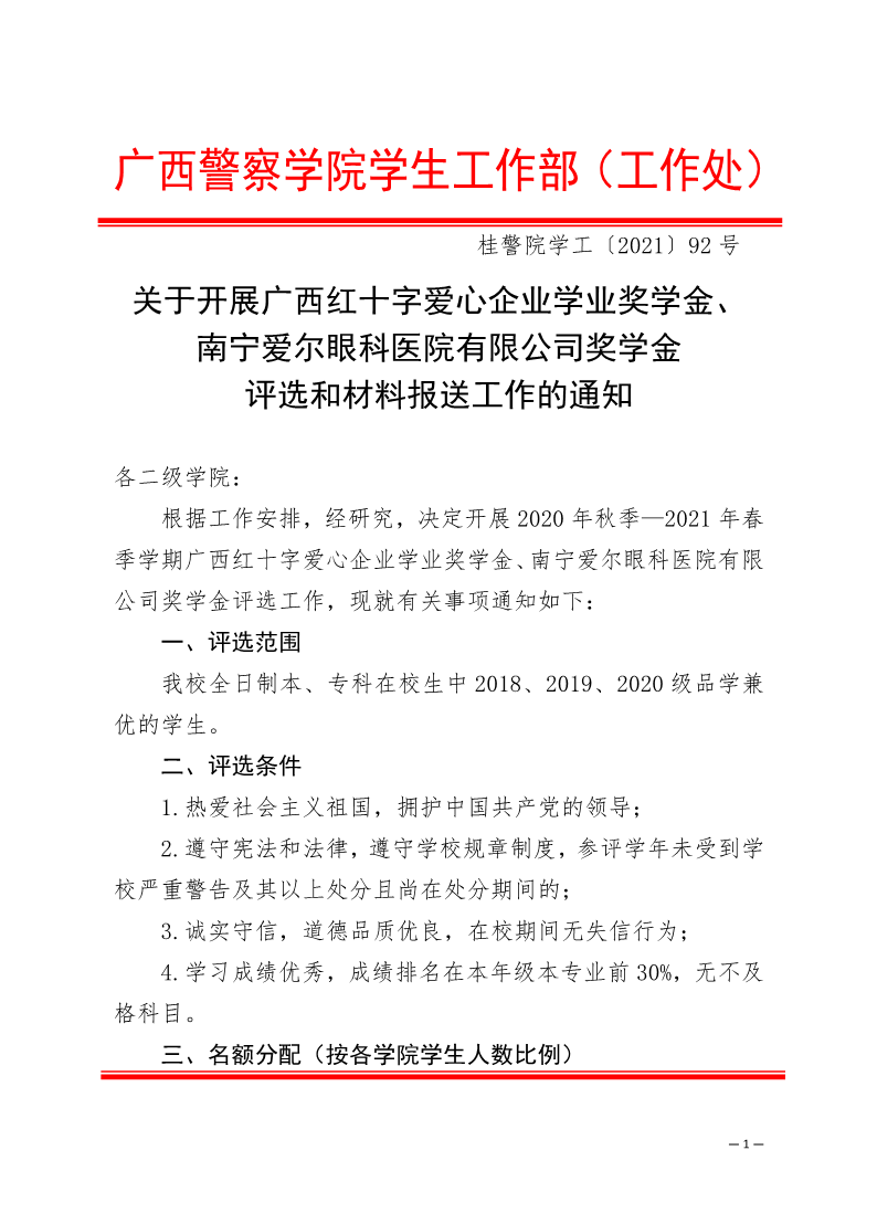 关于开展广西红十字爱心企业学业奖学金、南宁爱尔眼科医院有限公司奖学金评选和材料报送工作的通知 来源: 发布时间:2021-12-09 11:15:44 浏览次数: 次 【字体:小 大】 分享到: 【打印正文】