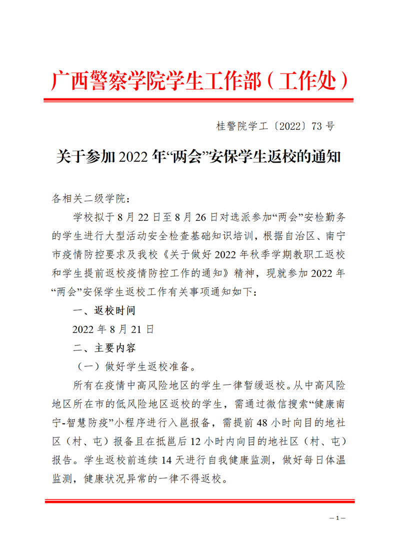 关于参加2022年“两会”安保学生返校的通知 来源: 发布时间:2022-08-17 11:00:54 浏览次数: 次 【字体:小 大】 附件1:自我健康状况及相关信息真实性承诺书.pdf附件2:“两会”安保学生返校情况统计表.pdf 分享到: 【打印正文】