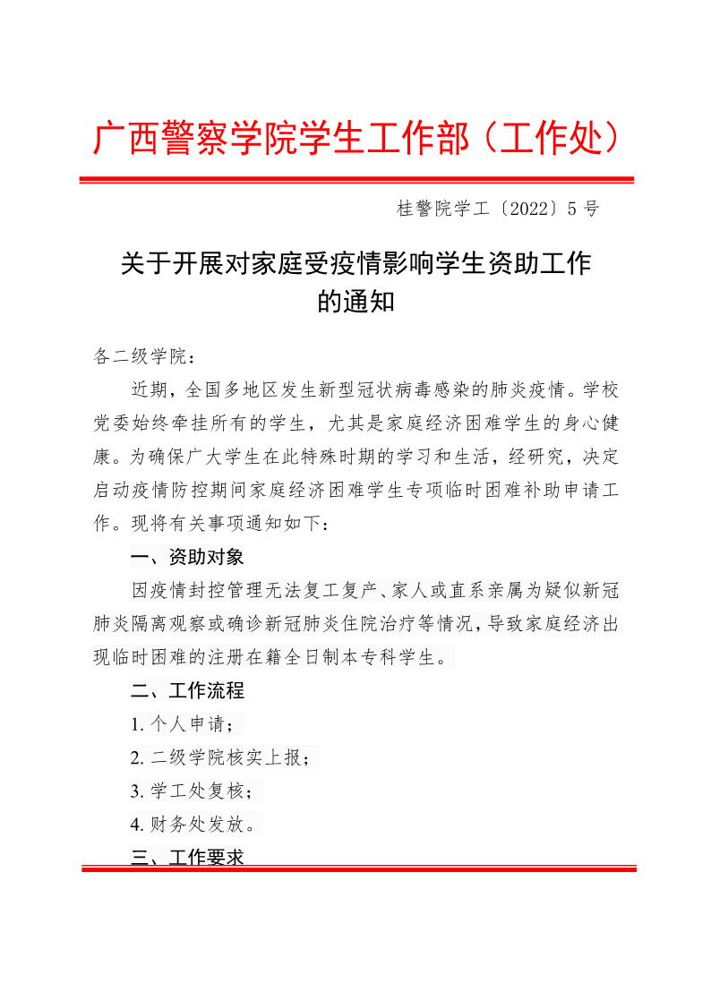 关于开展对家庭受疫情影响学生资助工作的通知 来源: 发布时间:2022-02-22 11:00:36 浏览次数: 次 【字体:小 大】 附件:广西警察学院2022年家庭受新冠肺炎疫情影响学生特殊困难补助申请表.pdf 分享到: 【打印正文】