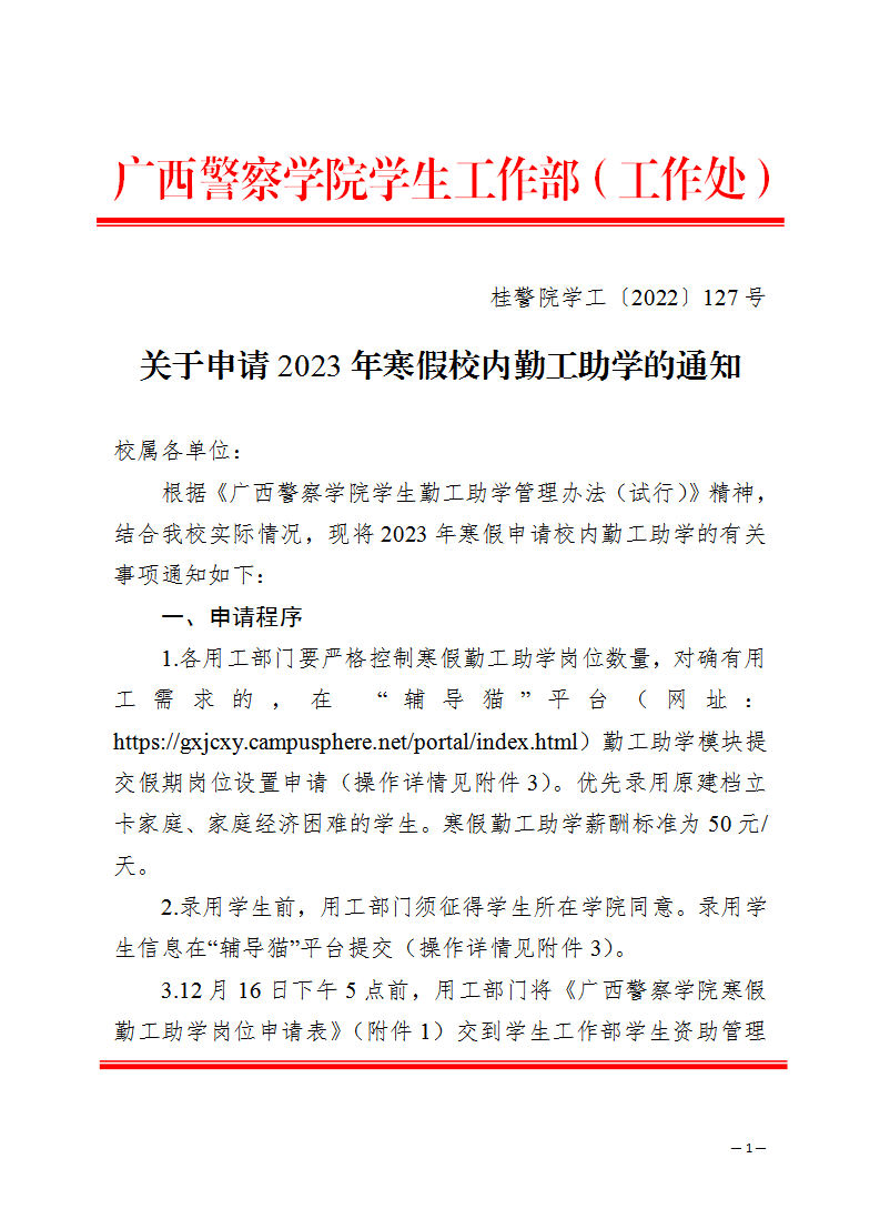 关于申请2023年寒假校内勤工助学的通知 来源: 发布时间:2022-12-13 11:00:23 浏览次数: 次 【字体:小 大】 附件1: 广西警察学院寒假勤工助学岗位申请表.pdf附件2: 2023年寒假勤工助学报酬预先发放表.pdf附件3 :“辅导猫”平台申请勤工助学假期岗位流程.pdf 分享到: 【打印正文】