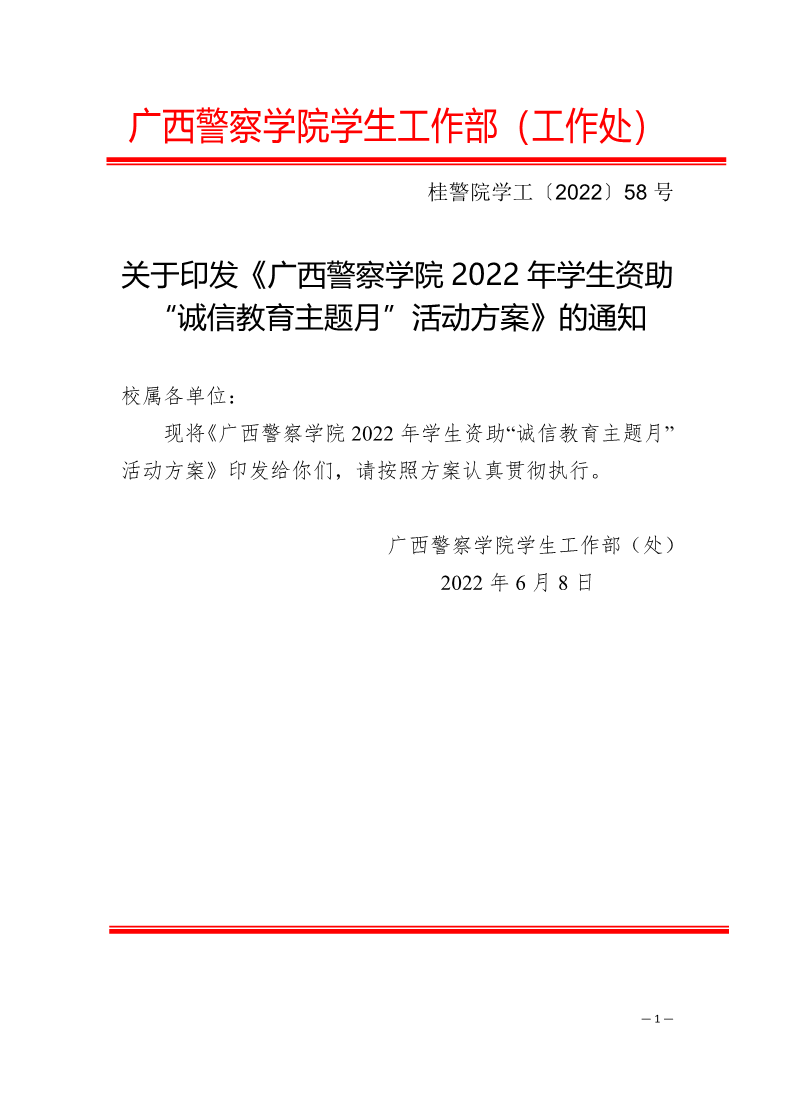关于印发《广西警察学院2022年学生资助“诚信教育主题月”活动方案》的通知
