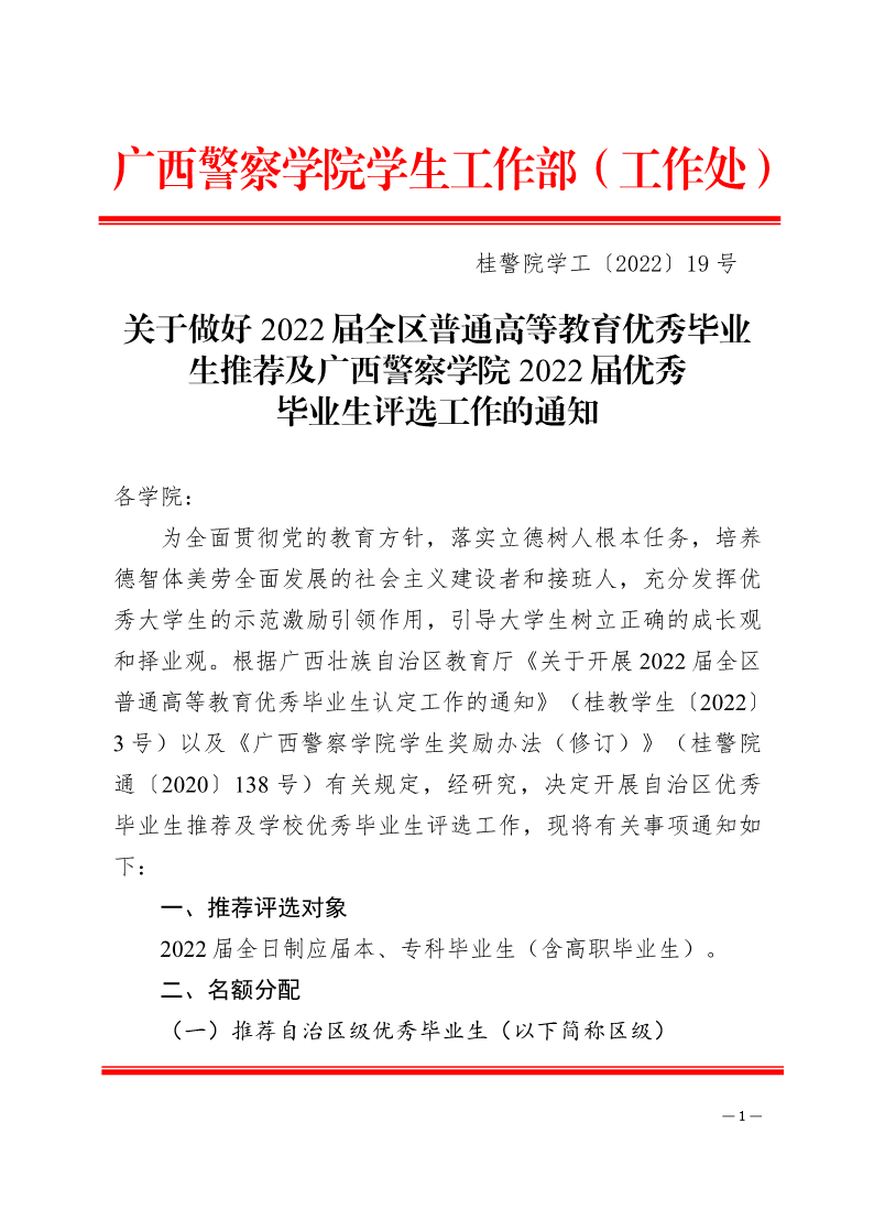 关于做好全区2022届普通高等教育优秀毕业生推荐及广西警察学院2022届优秀毕业生评选工作的通知 来源: 发布时间:2022-03-16 15:00:27 浏览次数: 次 【字体:小 大】 附件1:2022届区级优秀本科毕业生推荐名单表.pdf附件2:2022届区级优秀专科毕业生推荐名单表.pdf附件3:2022届广西普通高等教育优秀毕业生登记表.pdf附件4:2022届校级优秀本科毕业生推荐名单表.pdf附件5:2022届校级优秀专科毕业生推荐名单表.pdf附件6:广西警察学院2022届优秀毕业生登记表.pdf 分享到: 【打印正文】