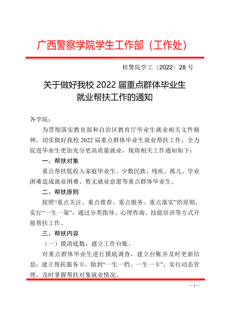 关于做好我校2022届重点群体毕业生就业帮扶工作的通知 来源: 发布时间:2022-04-14 15:00:12 浏览次数: 次 【字体:小 大】 附件1: 2022届重点群体毕业生就业帮扶服务卡.pdf附件2: 2022届重点群体毕业生就业帮扶工作台账.pdf 分享到: 【打印正文】
