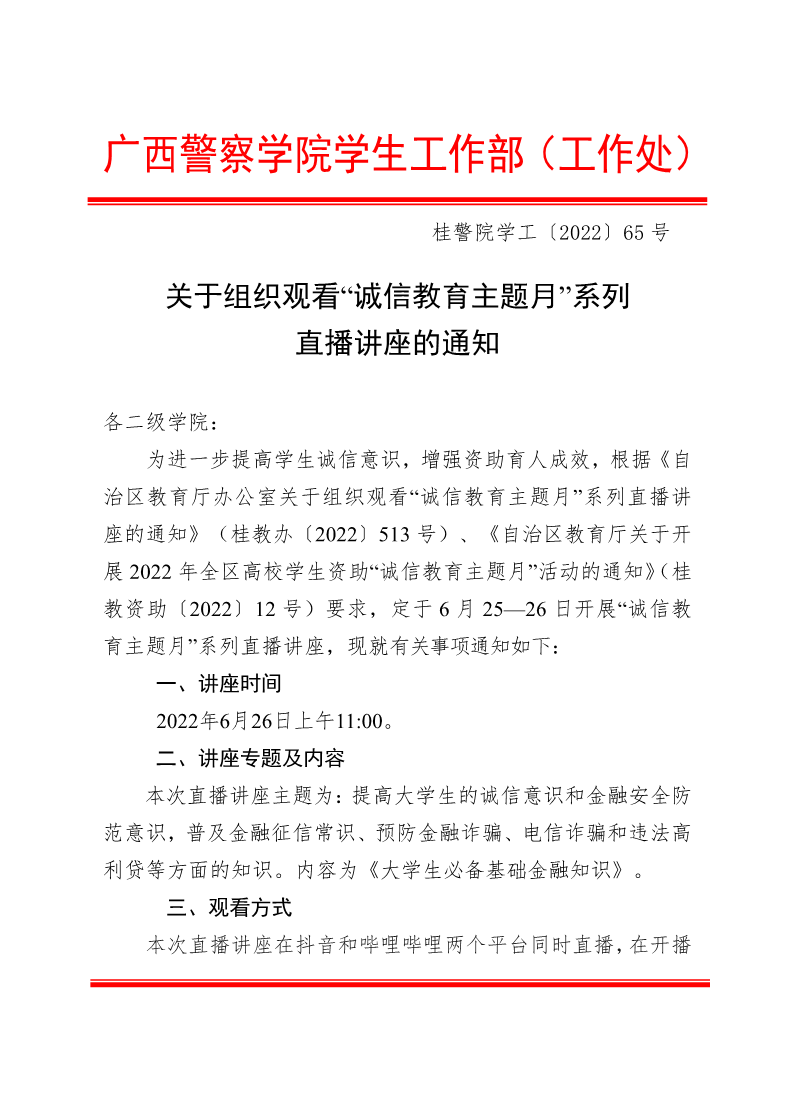 关于组织观看“诚信教育主题月”系列直播讲座的通知