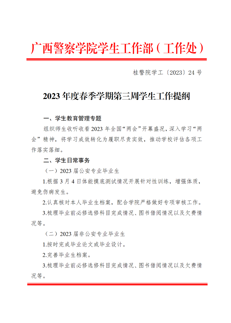 2023年度春季学期第三周学生工作提纲 来源: 发布时间:2023-03-05 09:00:43 浏览次数: 次 【字体:小 大】 附件:2023年度春季学期第二周学生工作提纲完成情况表(2月27日-3月3日).pdf 分享到: 【打印正文】
