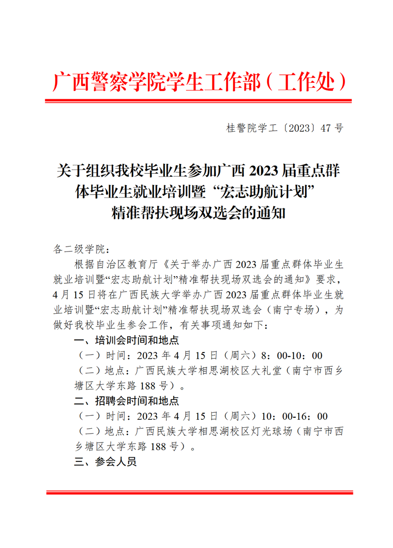 关于组织我校毕业生参加广西2023届重点群体毕业生就业培训暨“宏志助航计划”精准帮扶现场双选会的通知 47号 来源: 发布时间:2023-04-10 09:00:51 浏览次数: 次 【字体:小 大】 附件4:自治区教育厅办公室关于举办广西2023届重点群体毕业生就业培训暨“宏志助航计划”精准帮扶现场双选会的通知.pdf 分享到: 【打印正文】