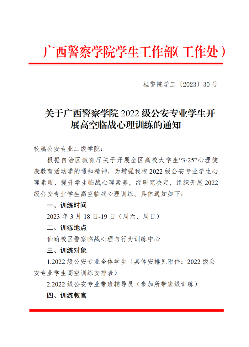 关于广西警察学院2022级公安专业学生开展高空临战心理训练的通知